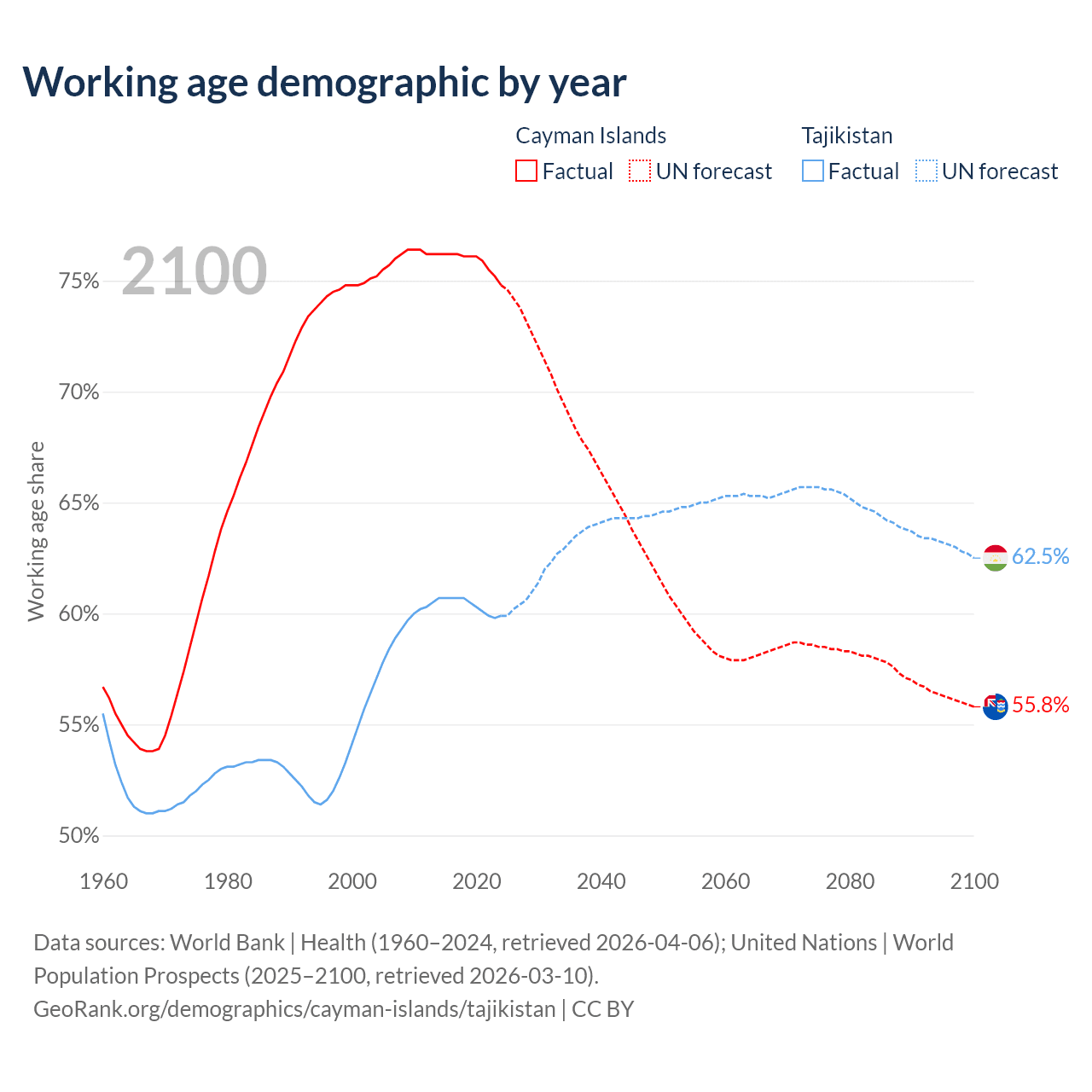 - The Cayman Islands has 58.1K working age adults (aged 15-64) vs 6.61M in Tajikistan.