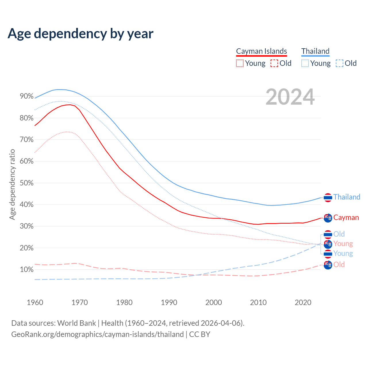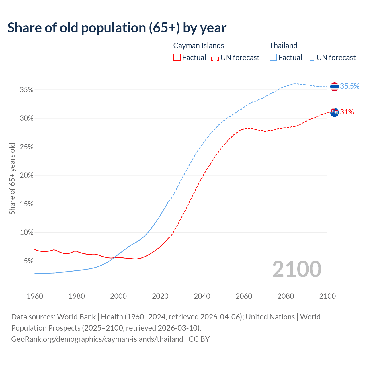 The share of older people aged 65 and over is 9% in the Cayman Islands and 15.4% in Thailand. Life expectancy in the Cayman Islands compared to Thailand .