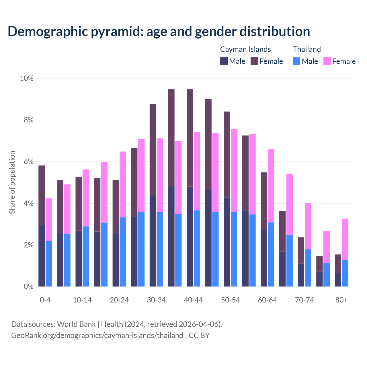 - As of 2026, the population of the Cayman Islands is 77.6K vs 71.6M in Thailand - 922 times difference.