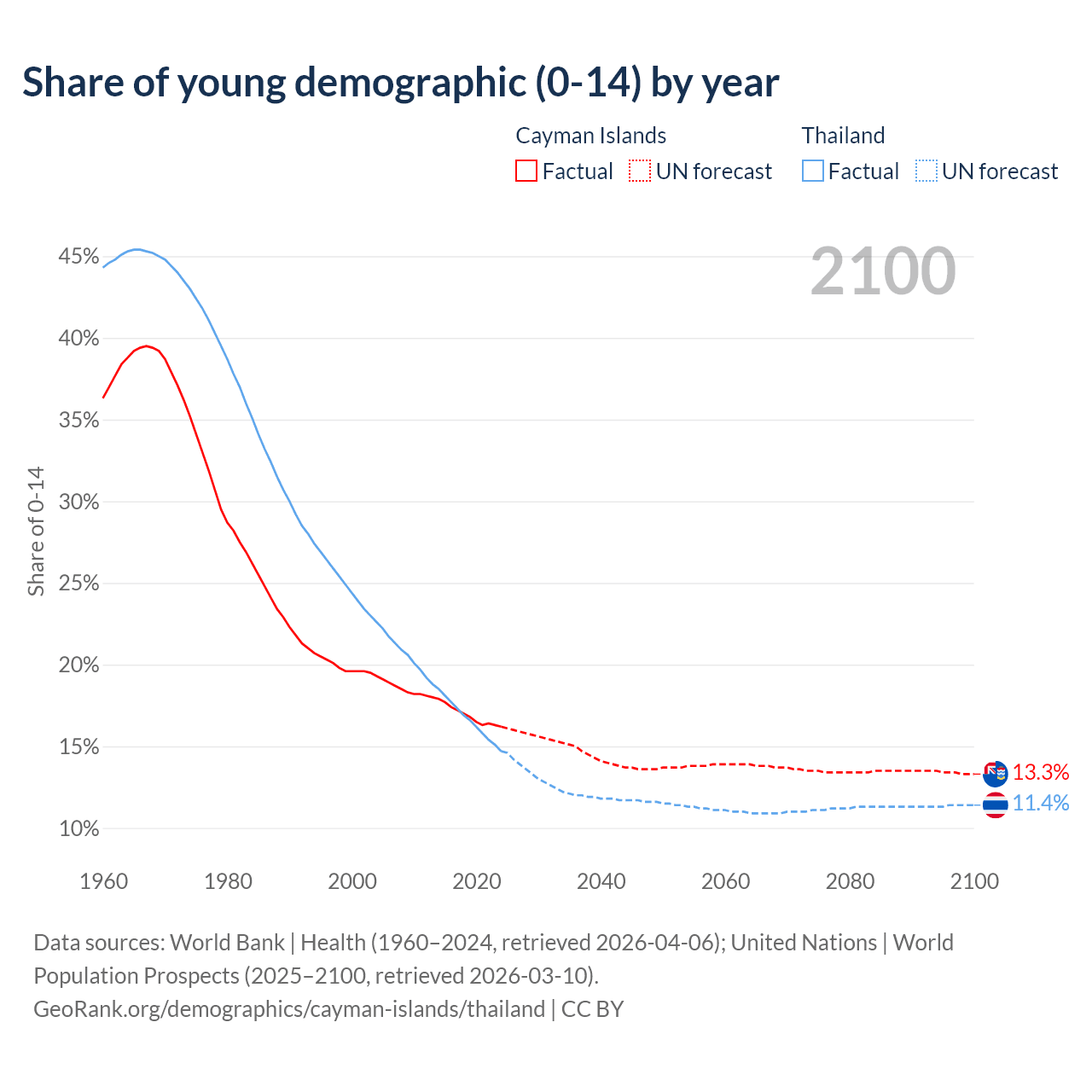 - The share of young demographic (0-15 years old) in the Cayman Islands is 16.2% vs 14.7% in Thailand.
