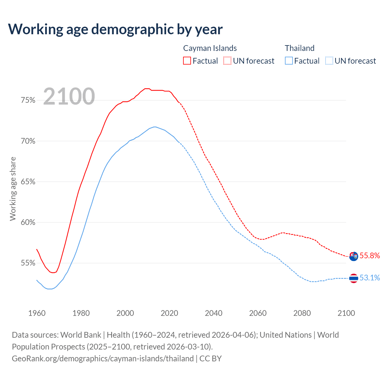 Median age Cayman Islands vs Thailand, 1960-2100