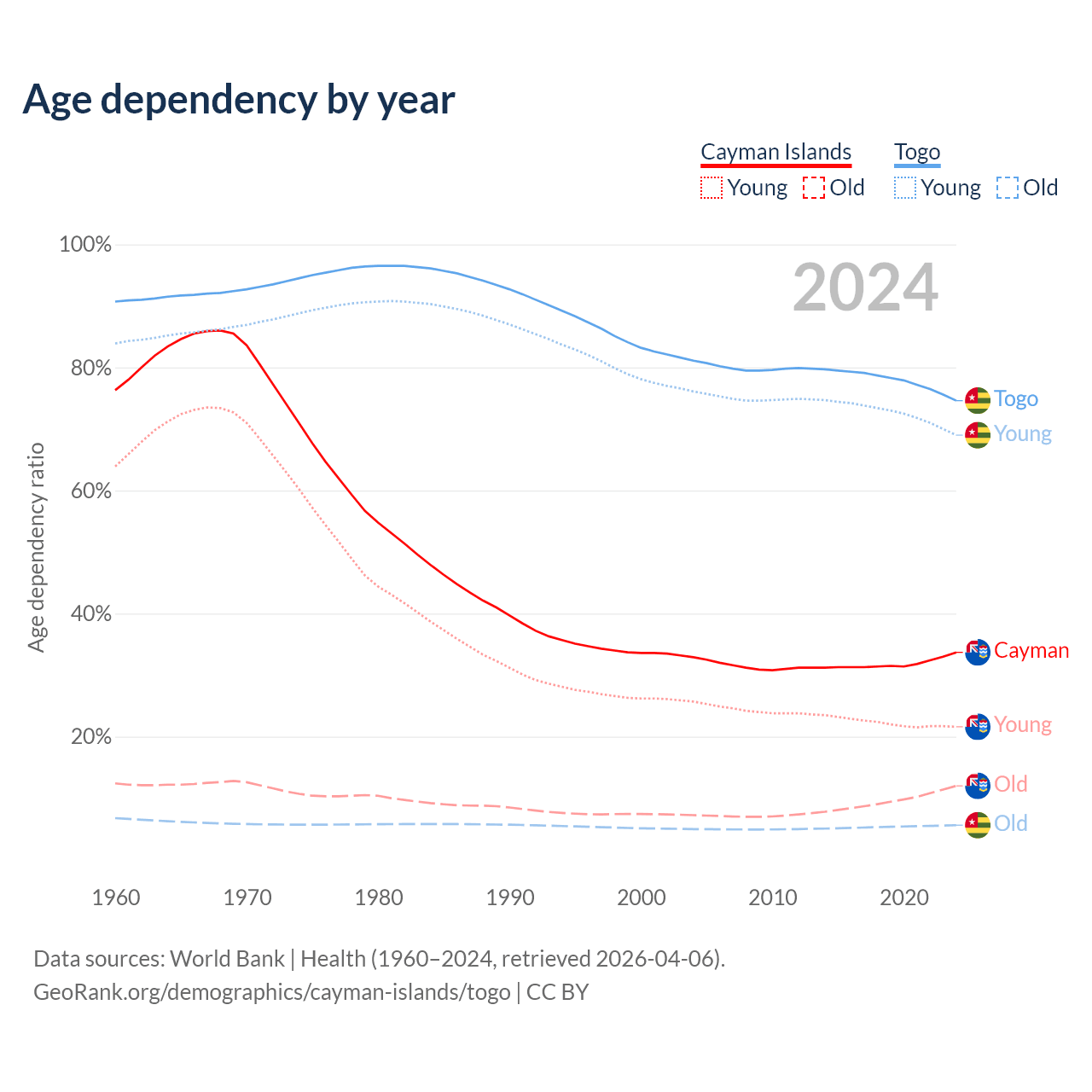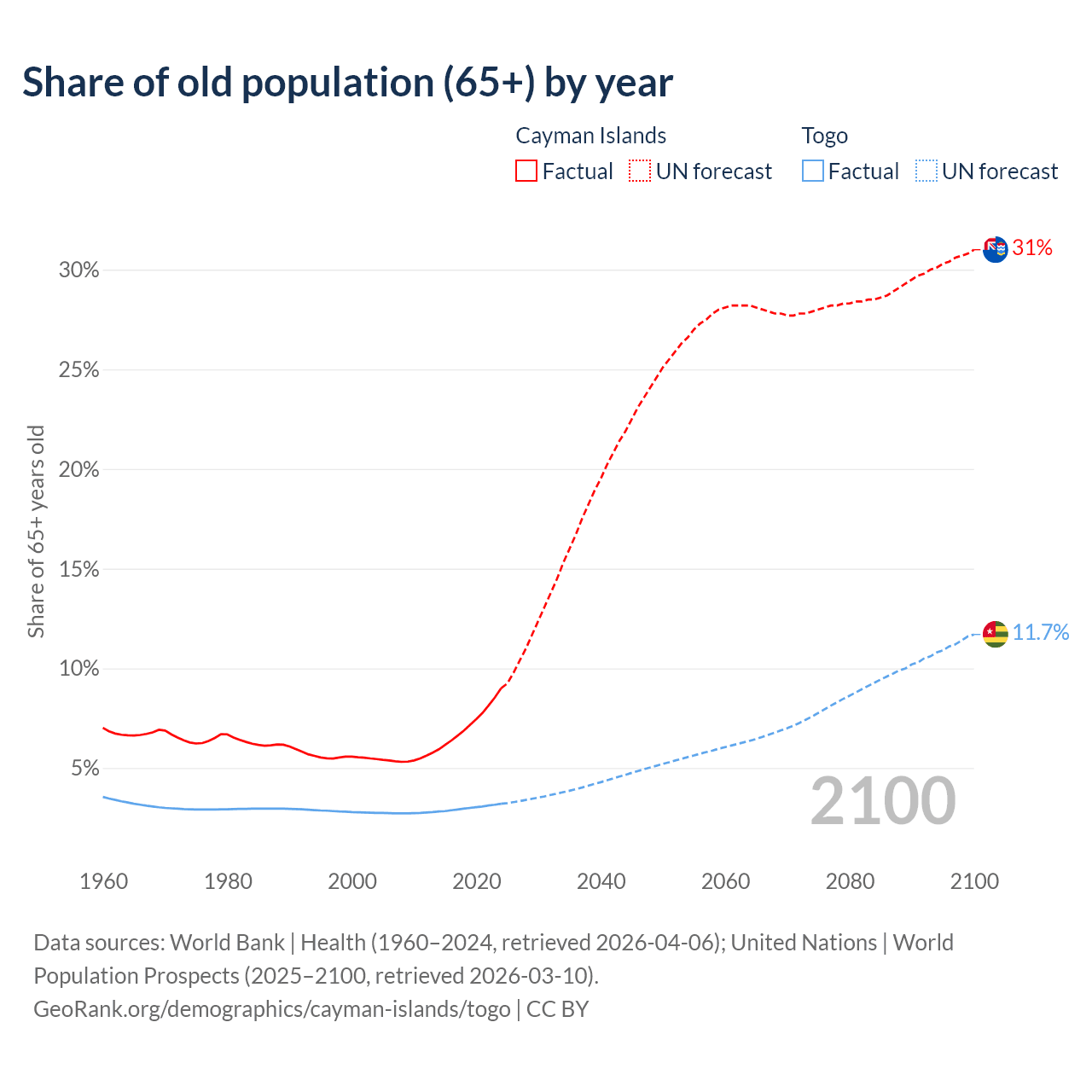 The share of older people aged 65 and over is 9% in the Cayman Islands and 3.21% in Togo. Life expectancy in the Cayman Islands compared to Togo .