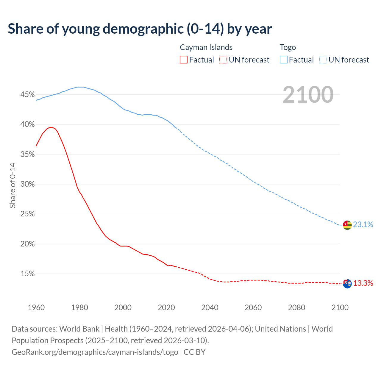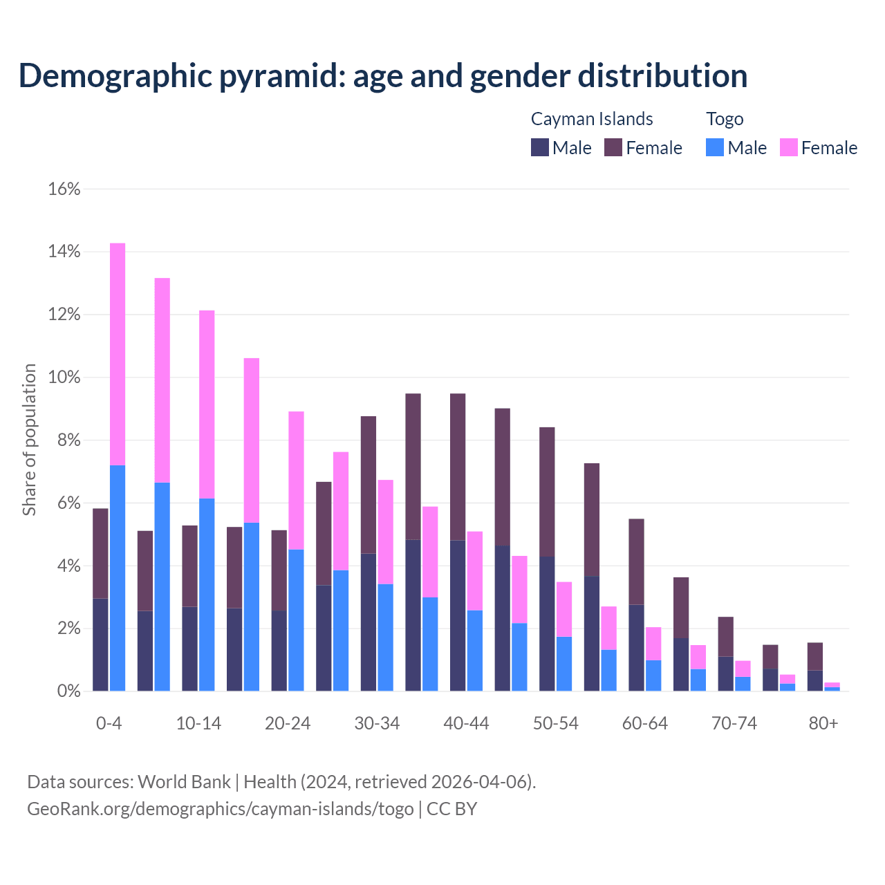 - The share of young demographic (0-15 years old) in the Cayman Islands is 16.2% vs 39.5% in Togo.