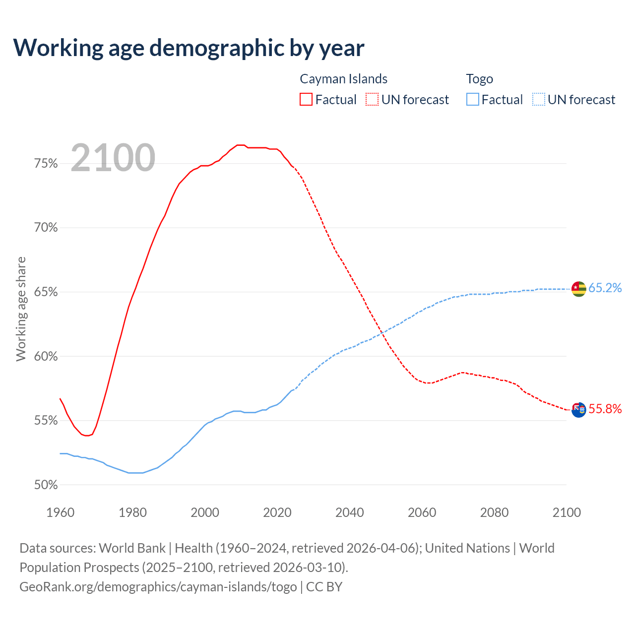 - The Cayman Islands has 58.1K working age adults (aged 15-64) vs 5.72M in Togo.