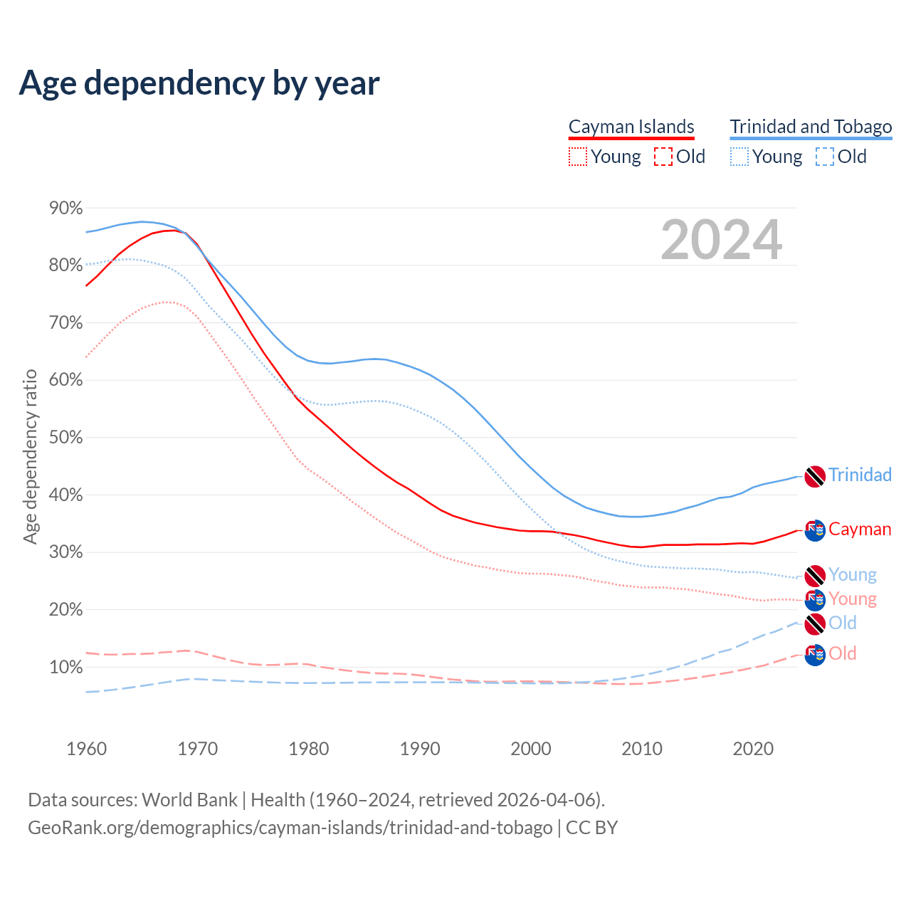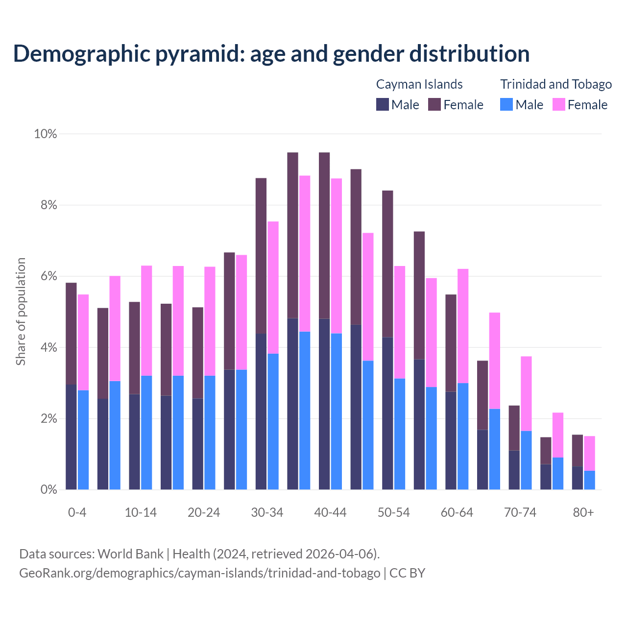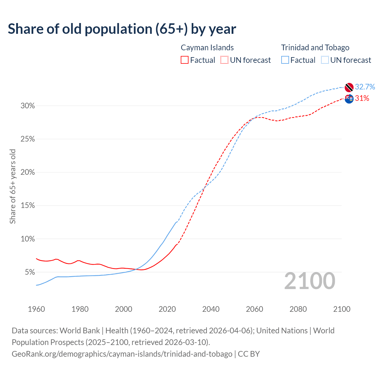 The share of older people aged 65 and over is 9% in the Cayman Islands and 12.4% in Trinidad and Tobago. Life expectancy in the Cayman Islands compared to Trinidad and Tobago .