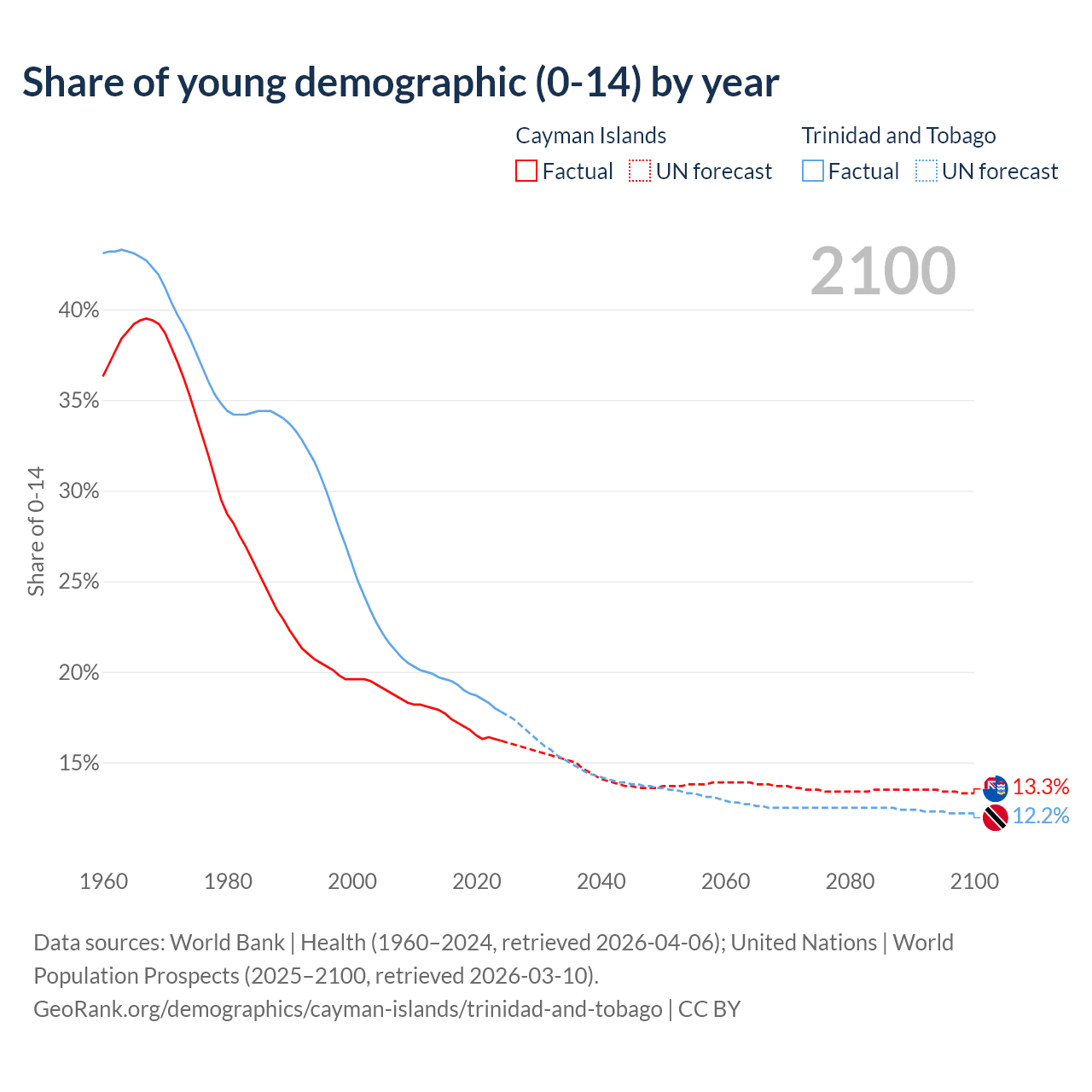- The share of young demographic (0-15 years old) in the Cayman Islands is 16.2% vs 17.8% in Trinidad and Tobago.