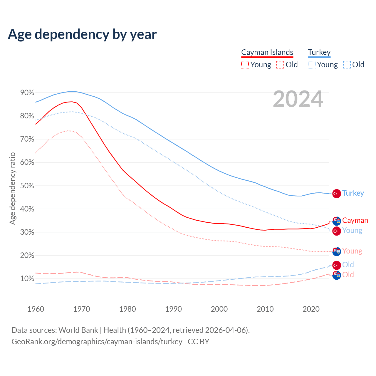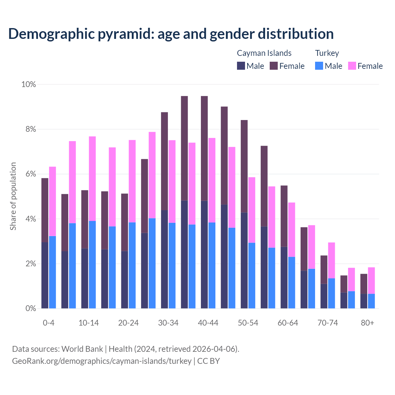 - The Cayman Islands is ranked 51/196 by median age (oldest to youngest) vs 83/196 for Turkey.