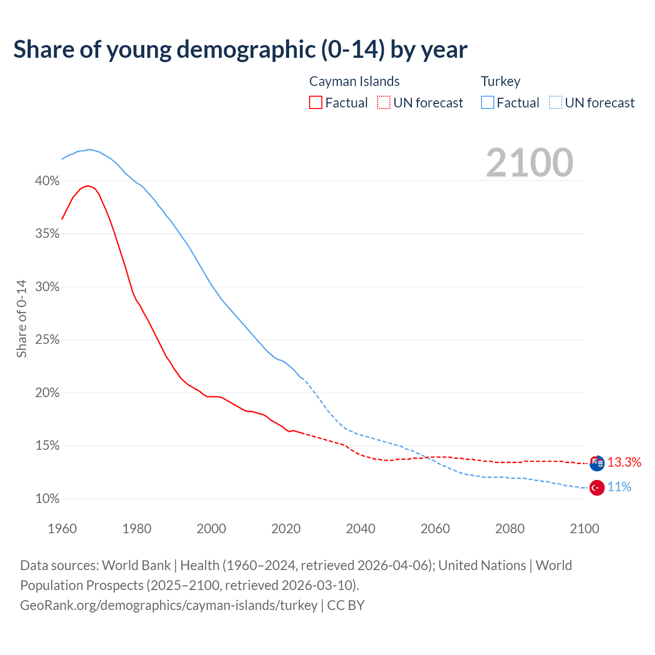 - The share of young demographic (0-15 years old) in the Cayman Islands is 16.2% vs 21.4% in Turkey.