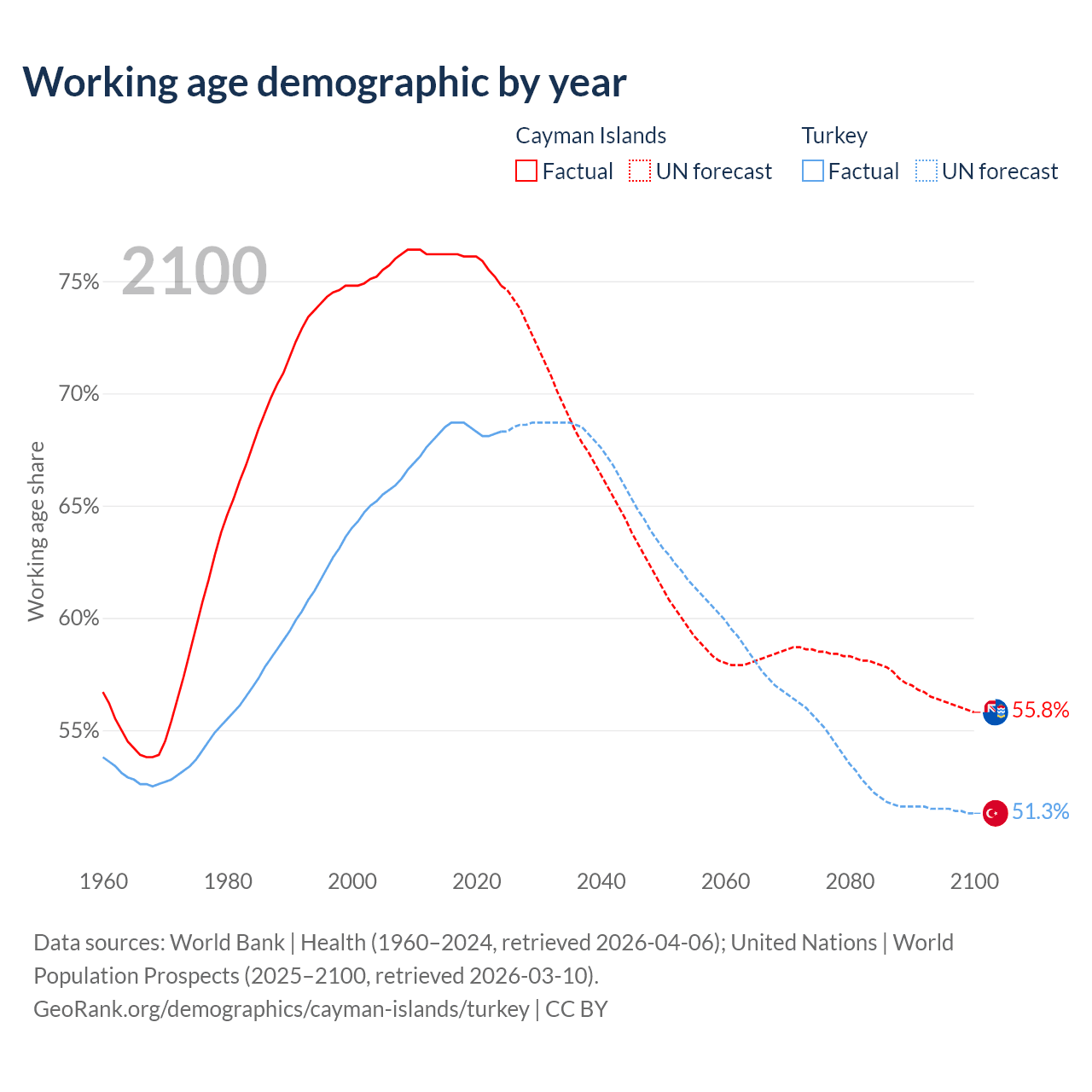 - The Cayman Islands has 58.1K working age adults (aged 15-64) vs 58.7M in Turkey.