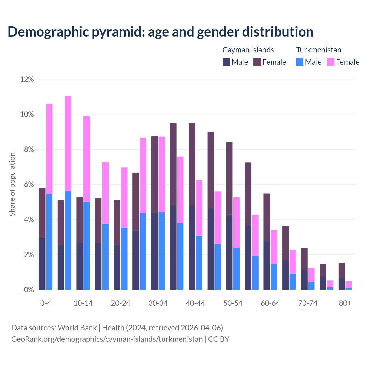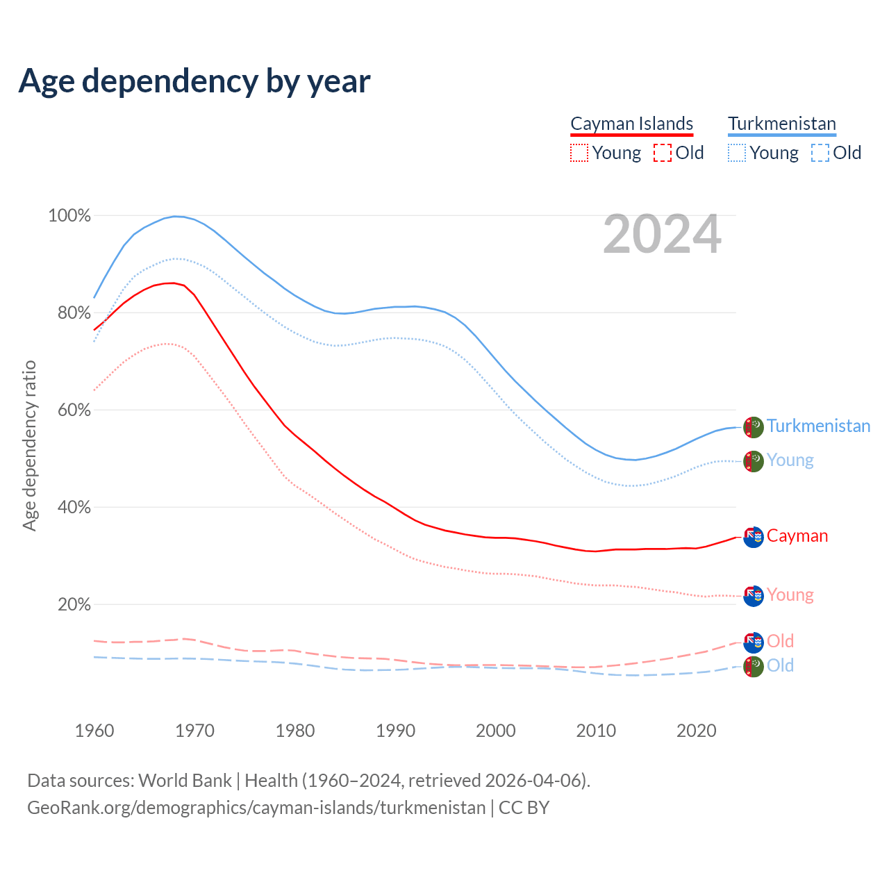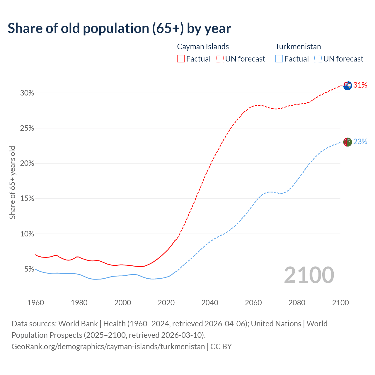 The share of older people aged 65 and over is 9% in the Cayman Islands and 4.53% in Turkmenistan. Life expectancy in the Cayman Islands compared to Turkmenistan .
