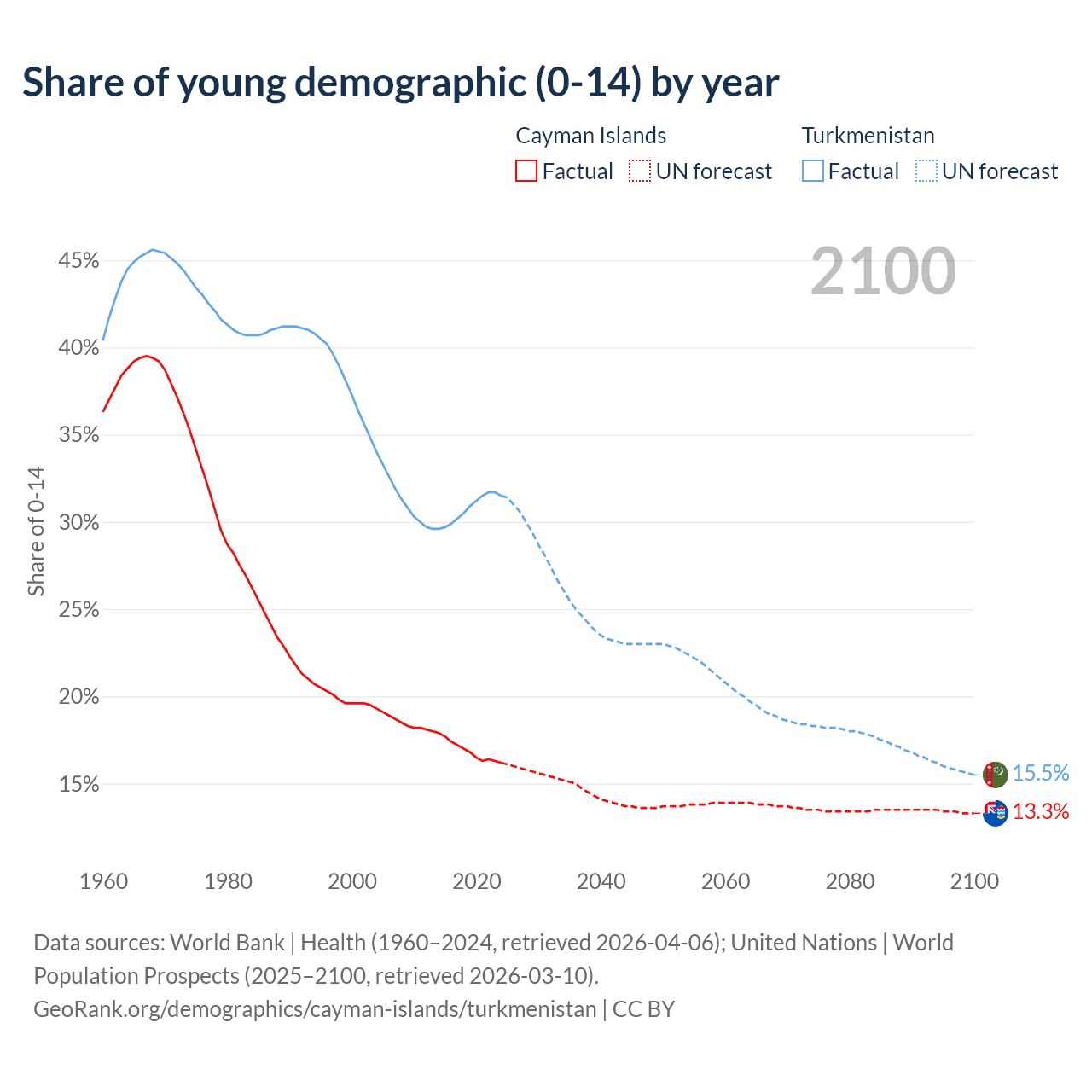 - The share of young demographic (0-15 years old) in the Cayman Islands is 16.2% vs 31.5% in Turkmenistan.