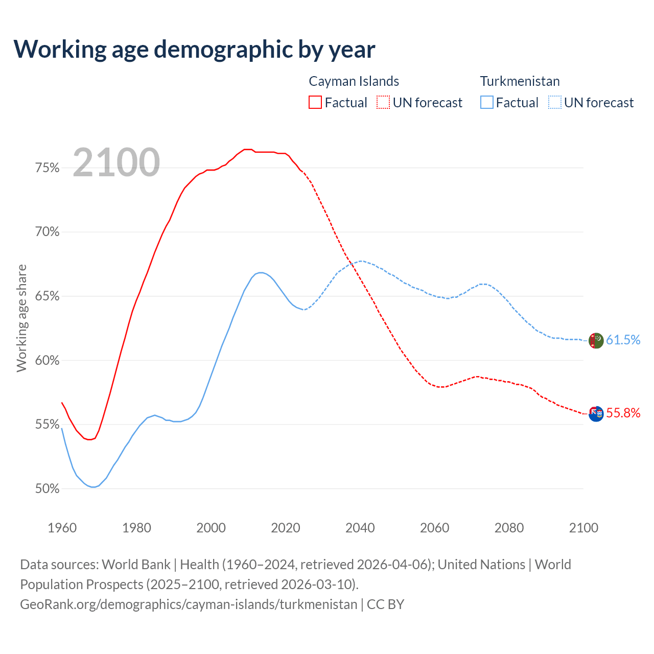 - The Cayman Islands has 58.1K working age adults (aged 15-64) vs 4.97M in Turkmenistan.