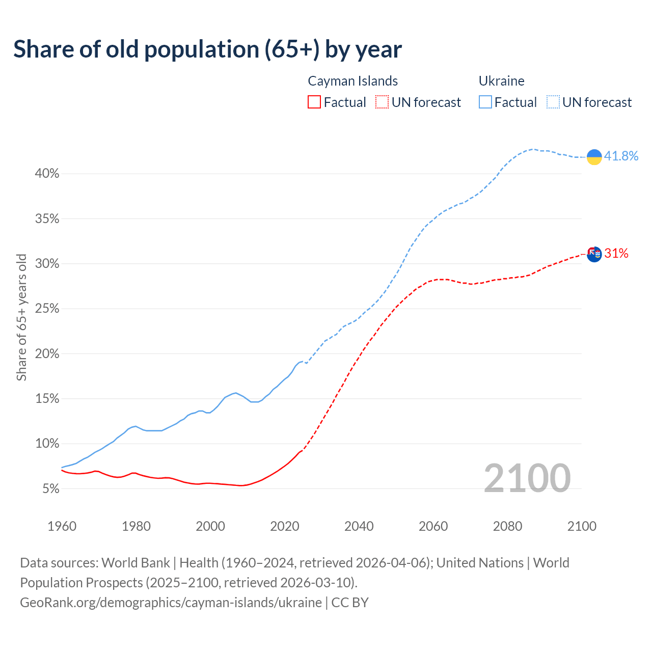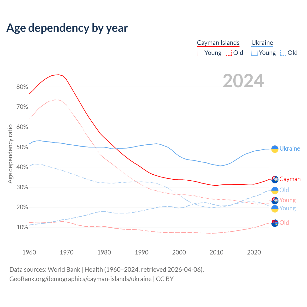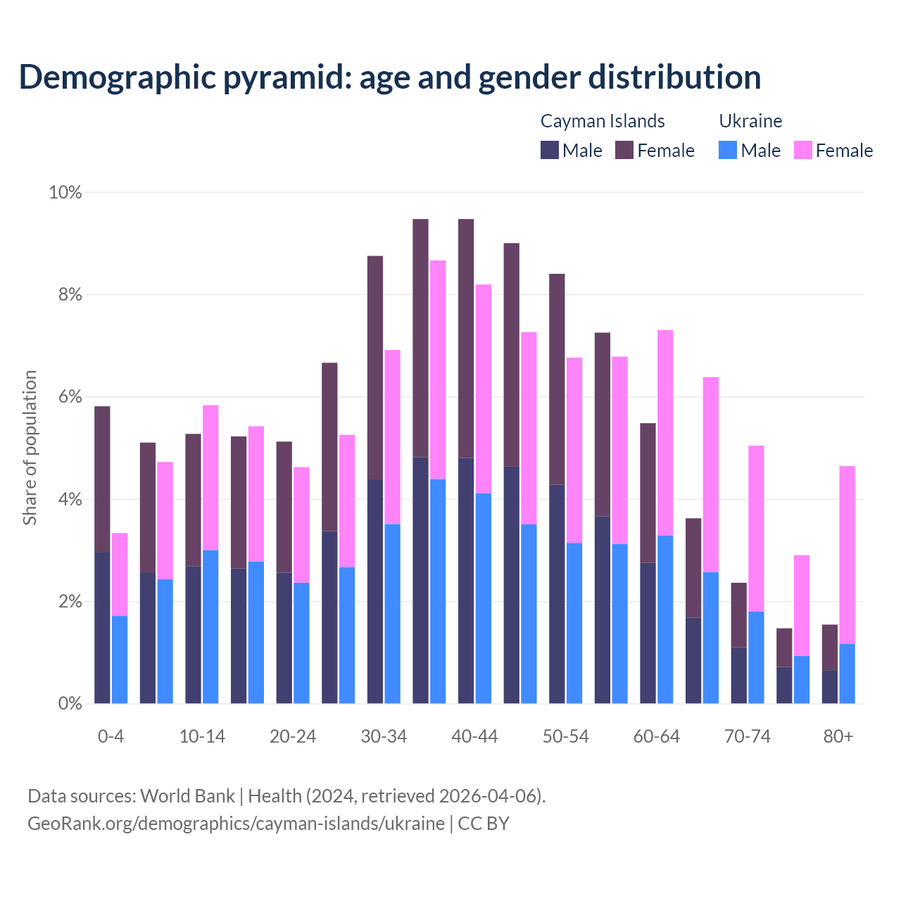 The share of older people aged 65 and over is 9% in the Cayman Islands and 19% in Ukraine. Life expectancy in the Cayman Islands compared to Ukraine .