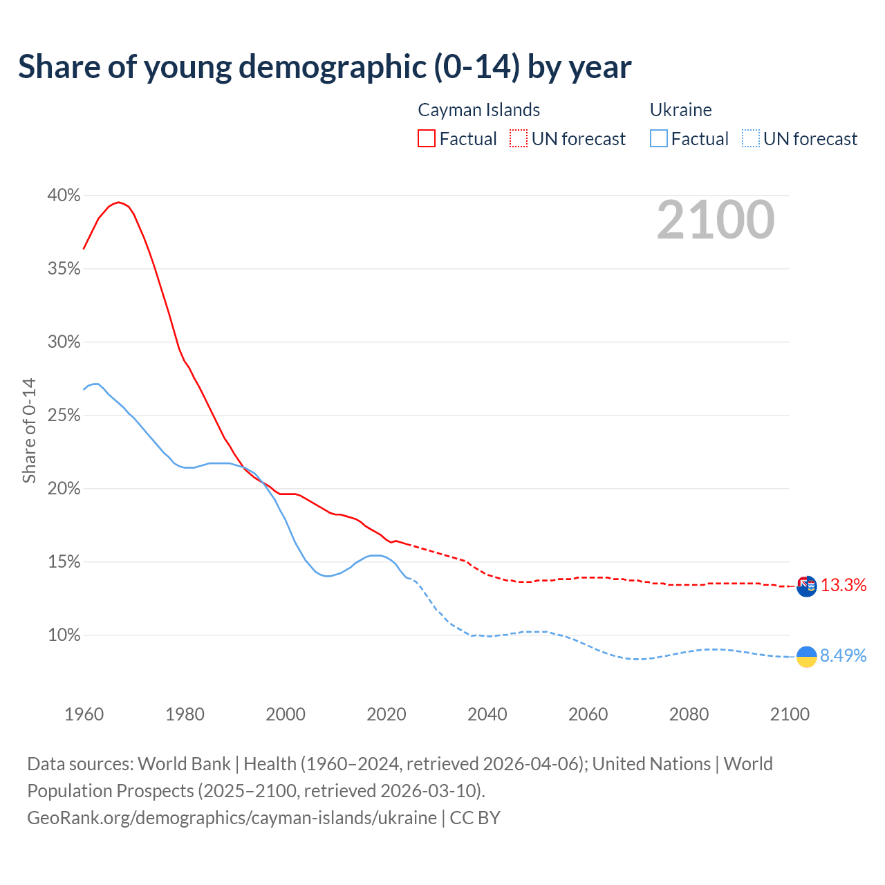 - The share of young demographic (0-15 years old) in the Cayman Islands is 16.2% vs 13.9% in Ukraine.
