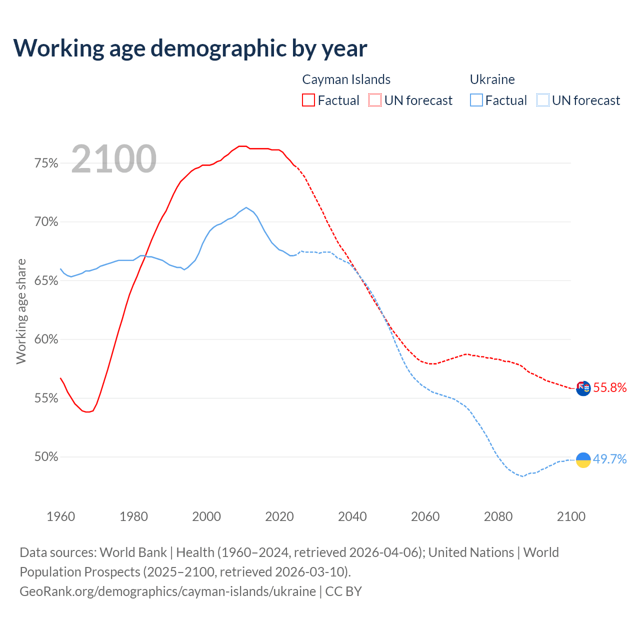 - The Cayman Islands has 58.1K working age adults (aged 15-64) vs 26.9M in Ukraine.