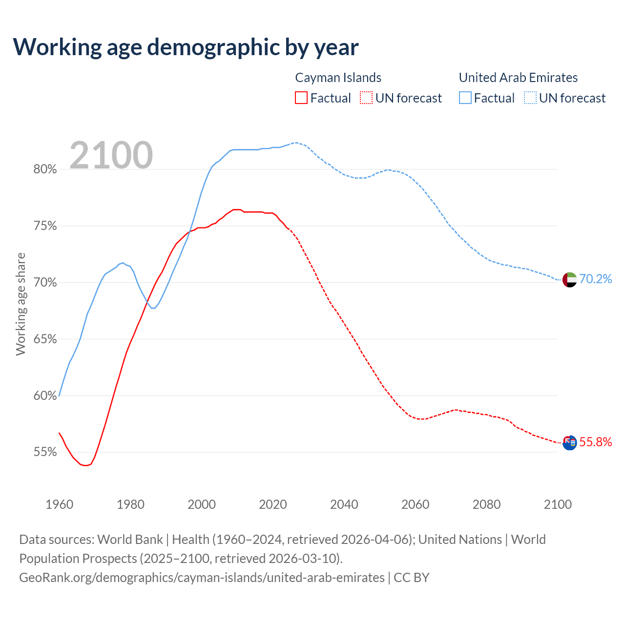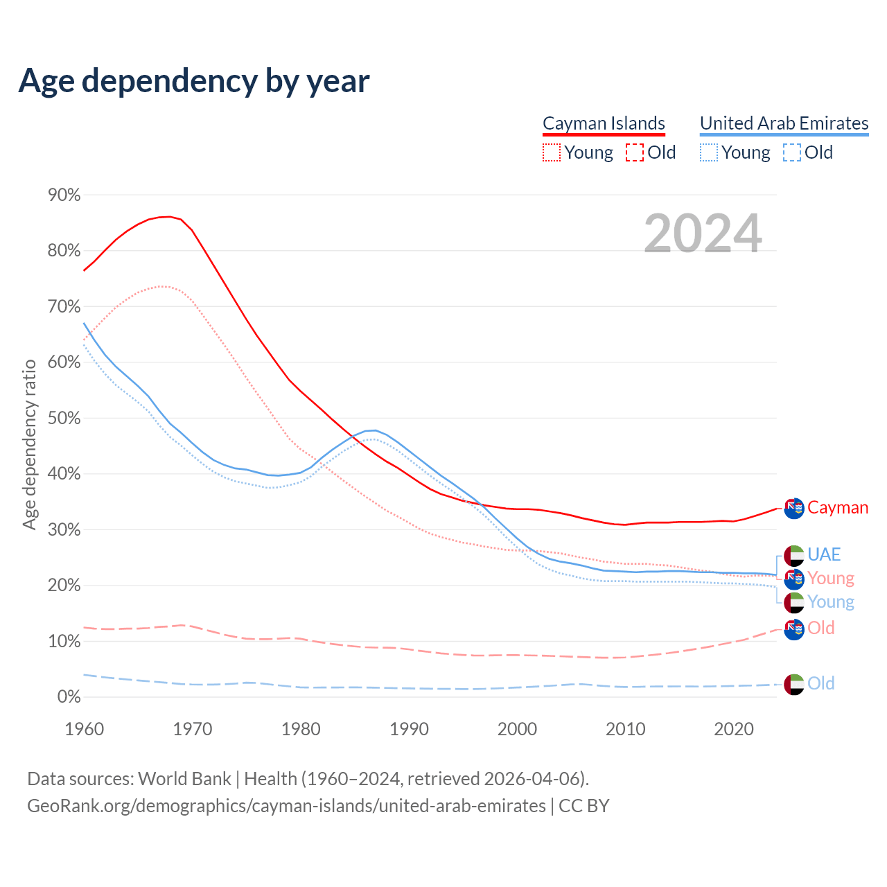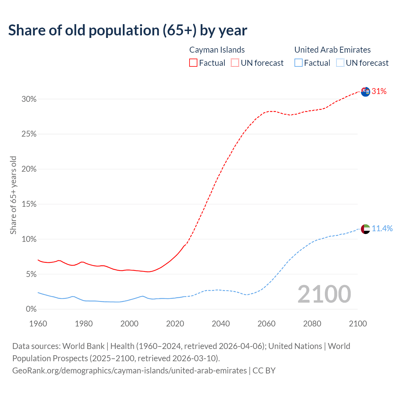 The share of older people aged 65 and over is 9% in the Cayman Islands and 1.77% in the United Arab Emirates. Life expectancy in the Cayman Islands compared to the United Arab Emirates .