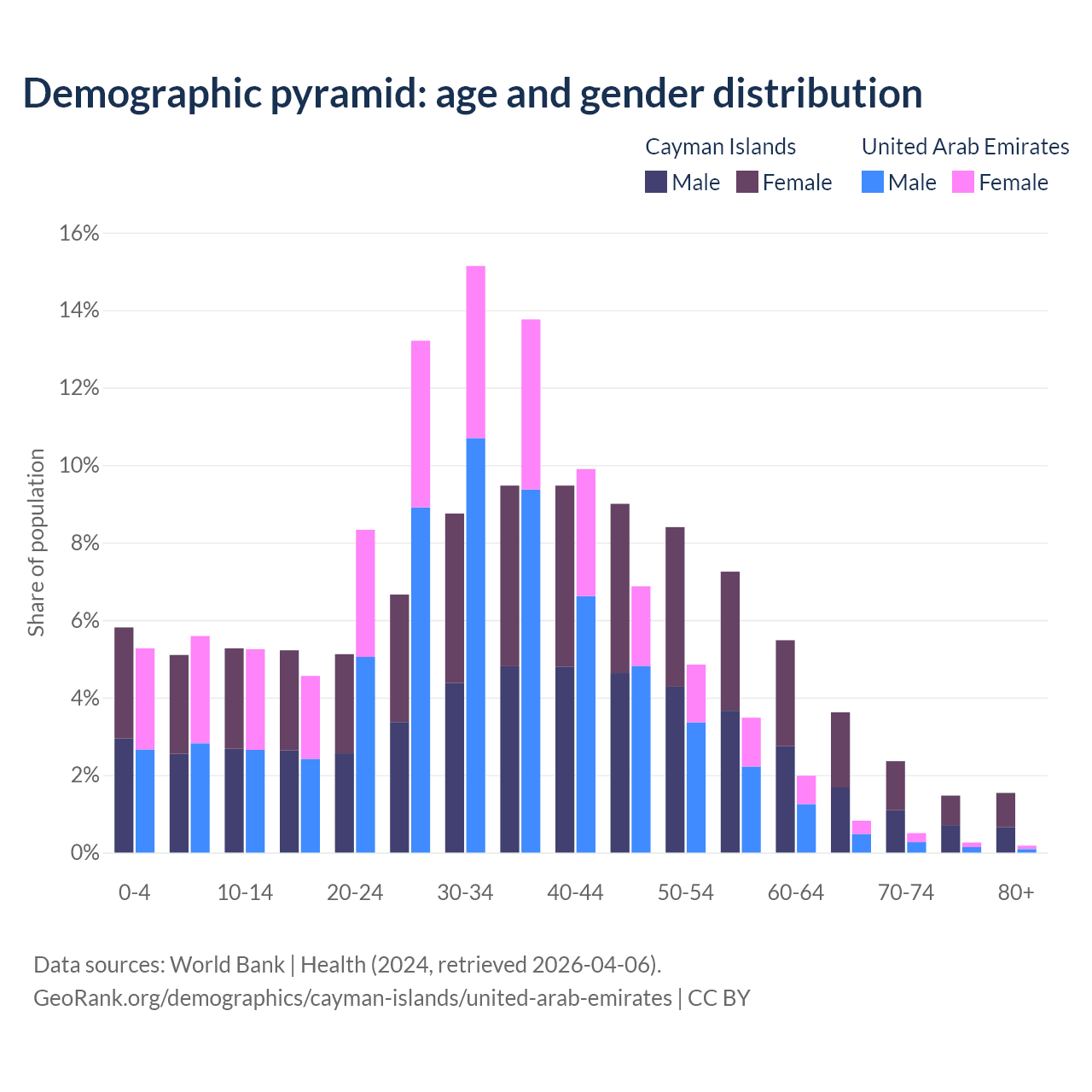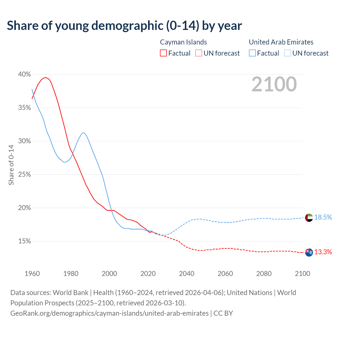 - The share of young demographic (0-15 years old) in the Cayman Islands is 16.2% vs 16.1% in the United Arab Emirates.