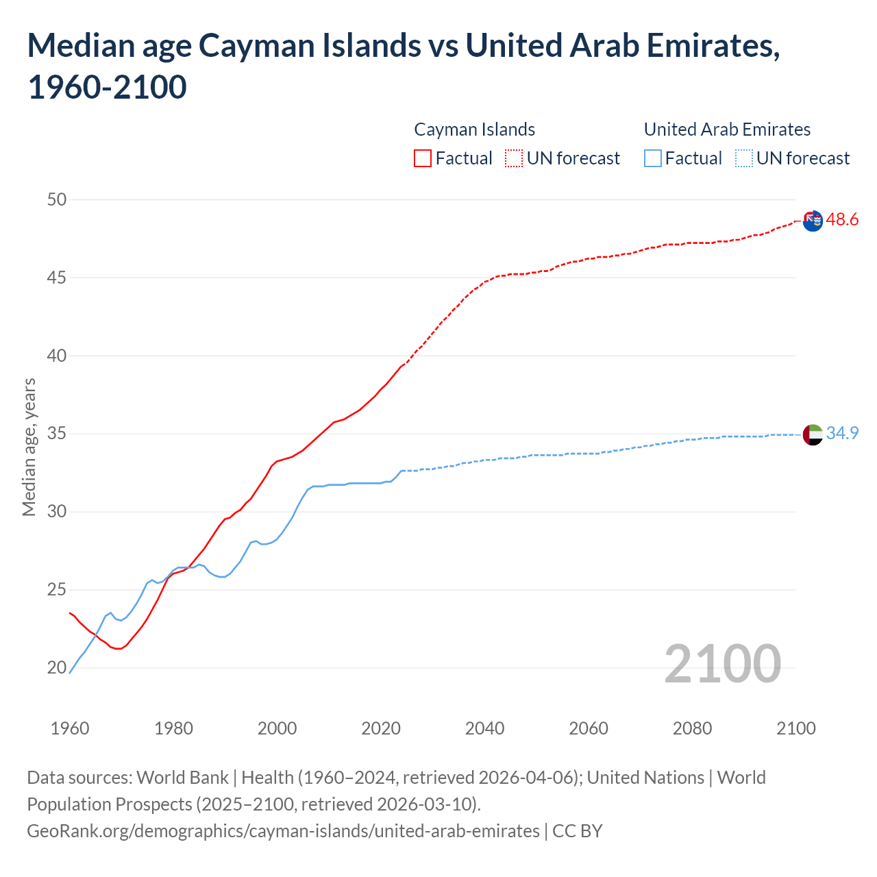 Median age Cayman Islands vs United Arab Emirates, 1960-2100