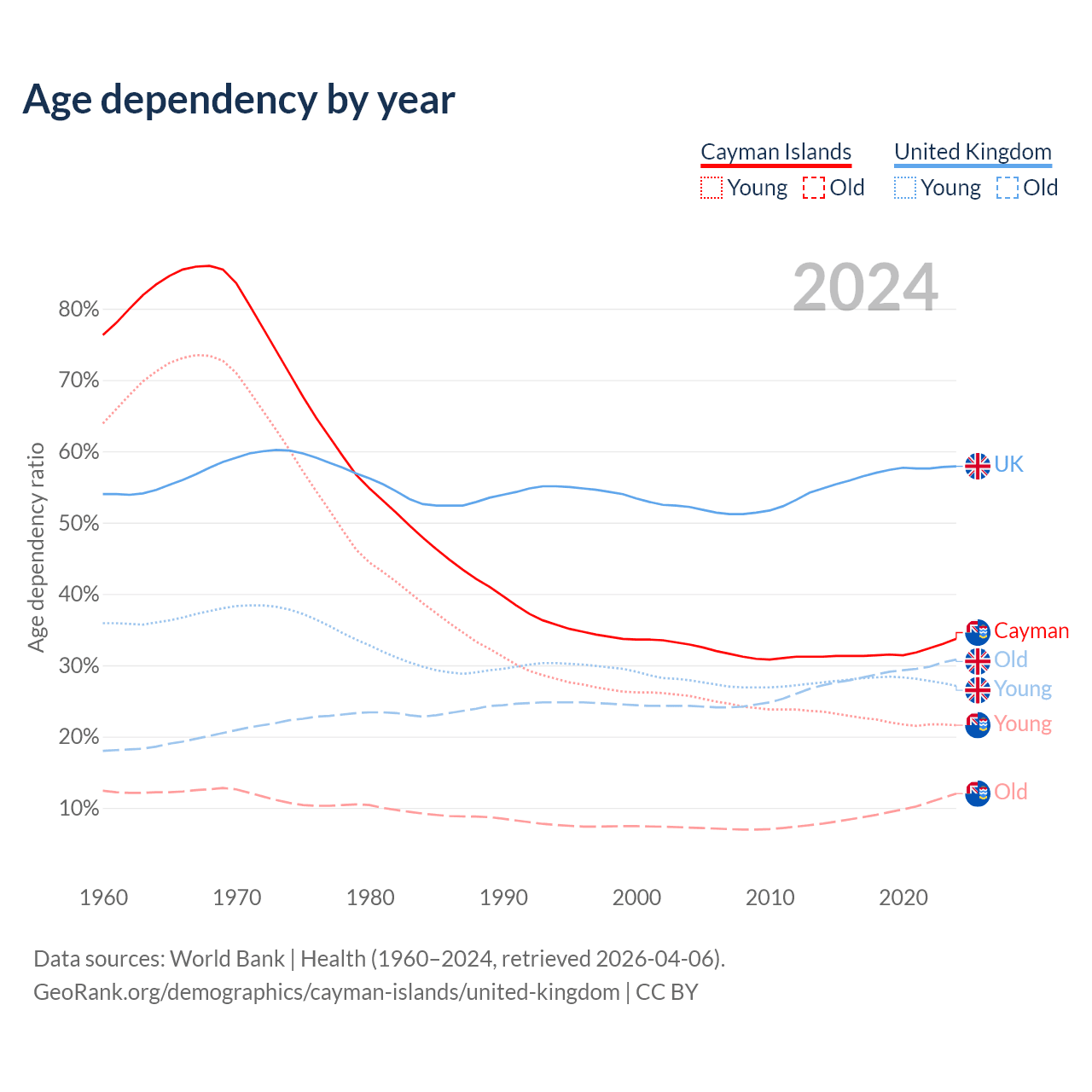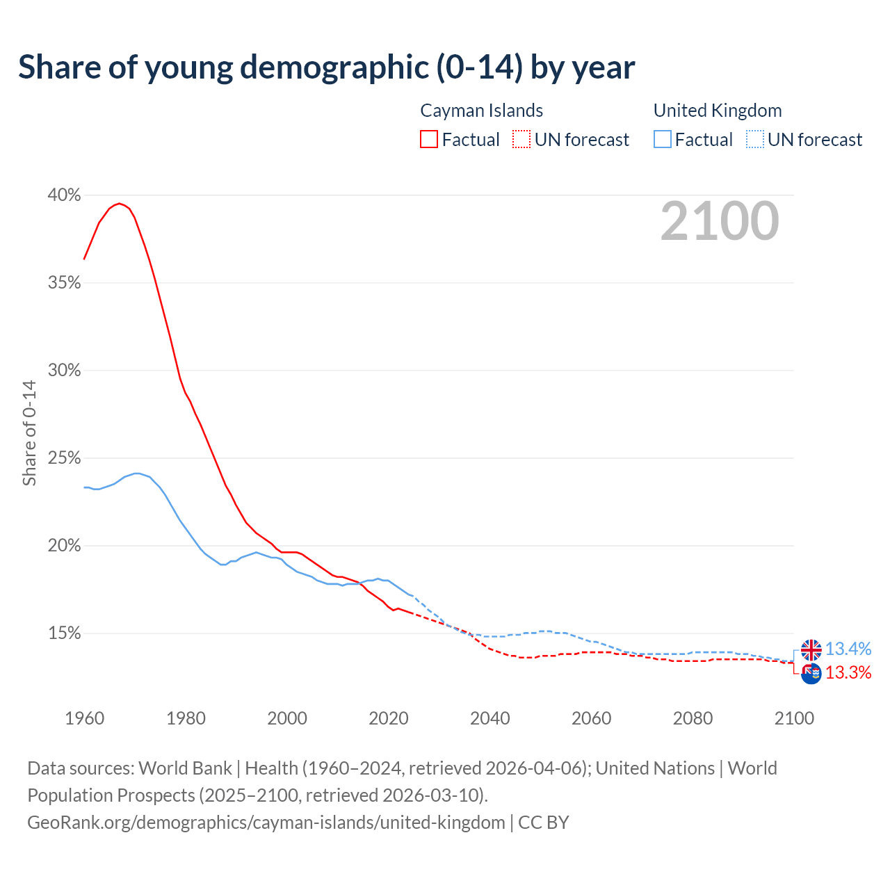 - The share of young demographic (0-15 years old) in the Cayman Islands is 16.2% vs 17.2% in the United Kingdom.