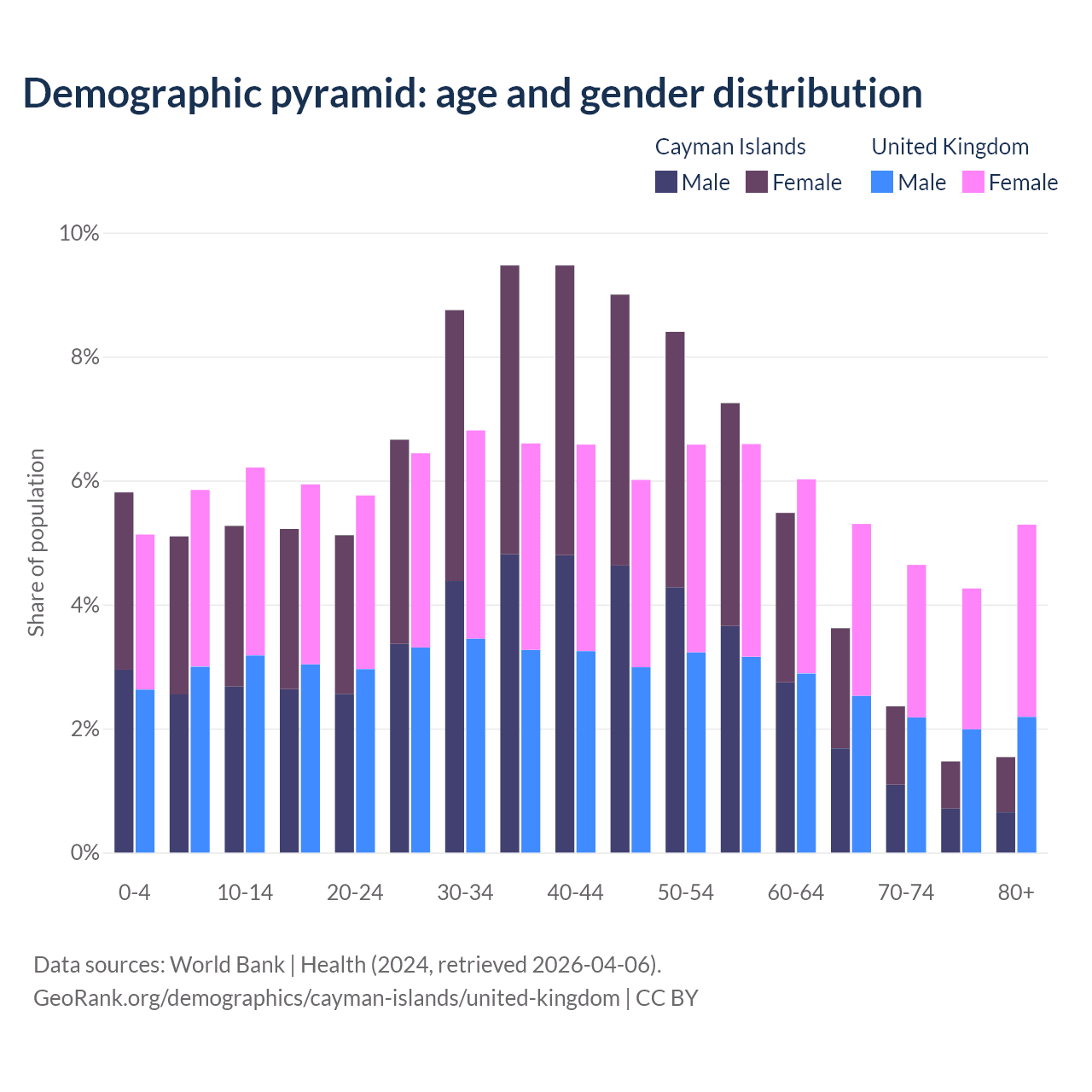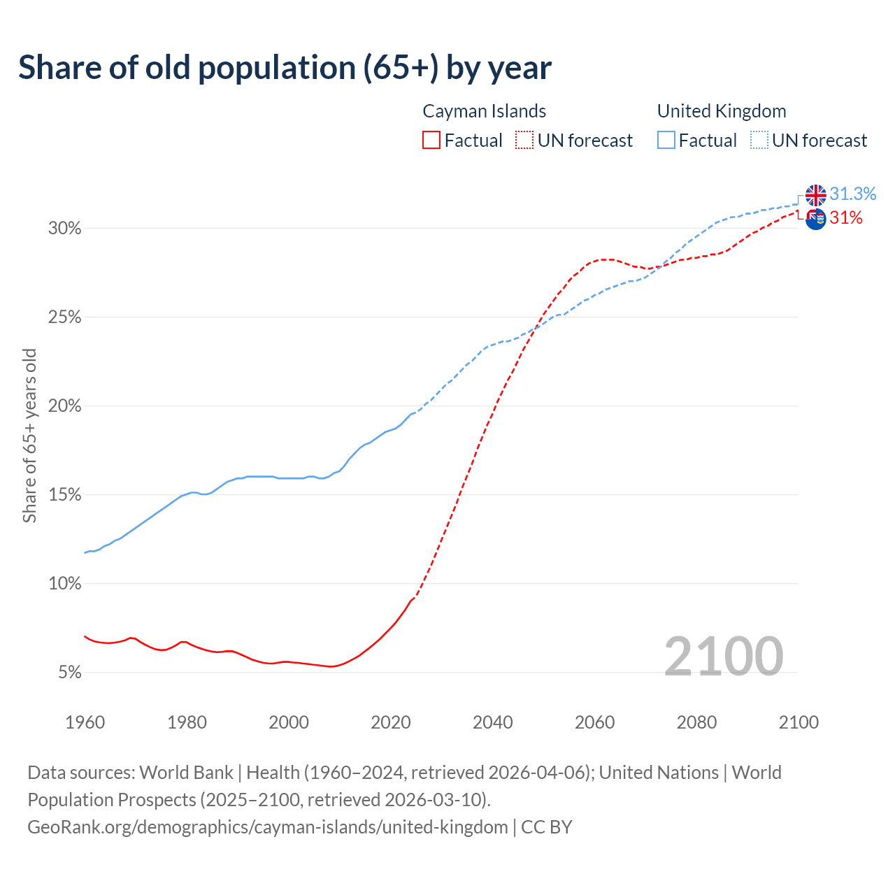 The share of older people aged 65 and over is 9% in the Cayman Islands and 19.5% in the United Kingdom. Life expectancy in the Cayman Islands compared to the United Kingdom .