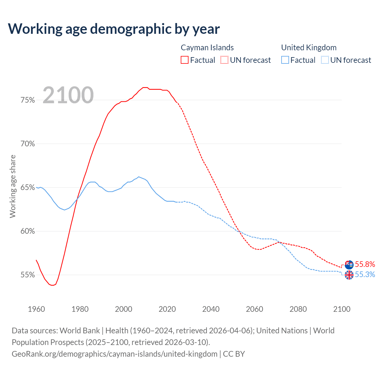 Median age Cayman Islands vs United Kingdom, 1960-2100