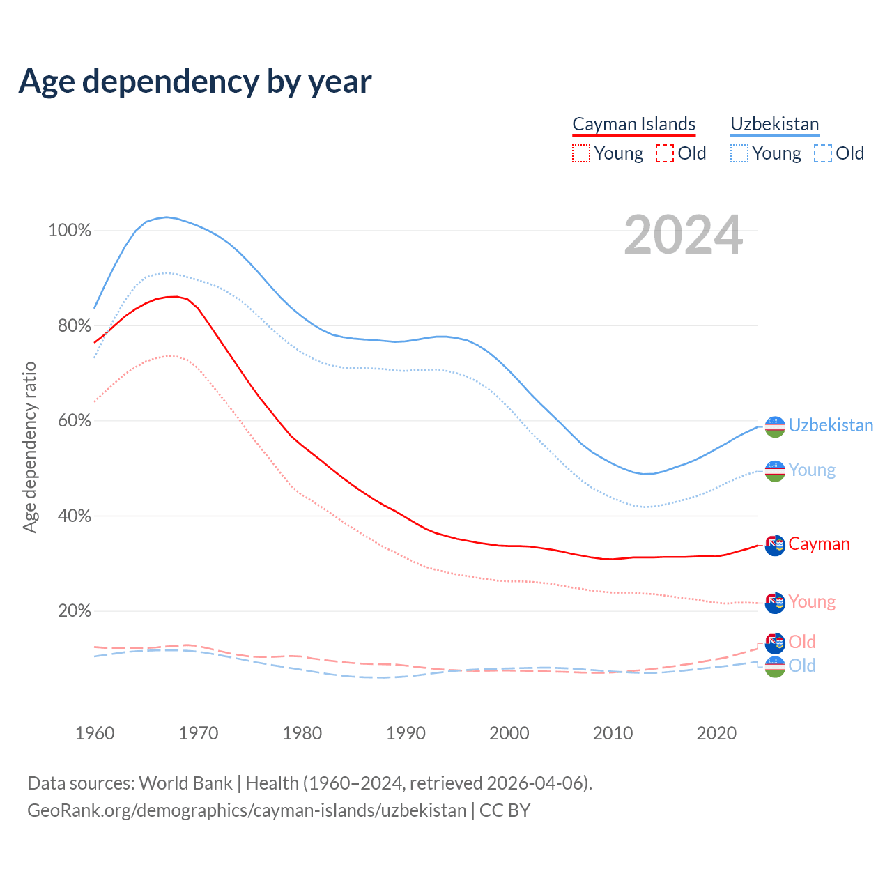Data sources: World Bank | Health (1960–2024, retrieved 2026-04-06); U.S. Census Bureau (1960–2024, retrieved 2026-02-08).