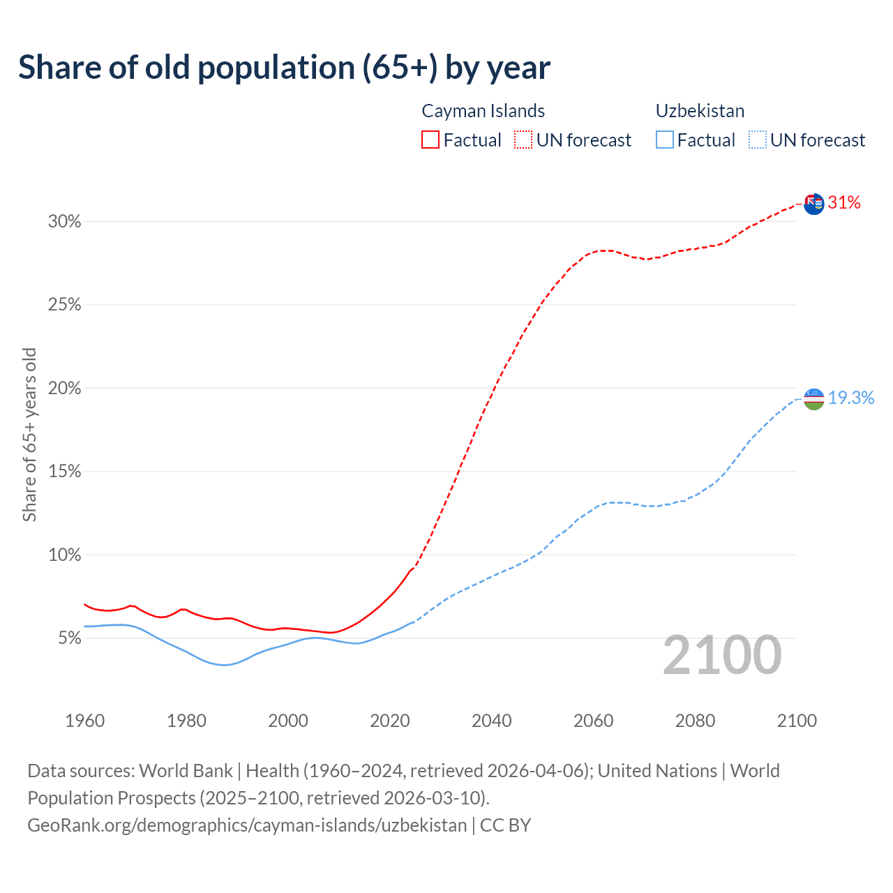 The share of older people aged 65 and over is 9% in the Cayman Islands and 5.86% in Uzbekistan. Life expectancy in the Cayman Islands compared to Uzbekistan .