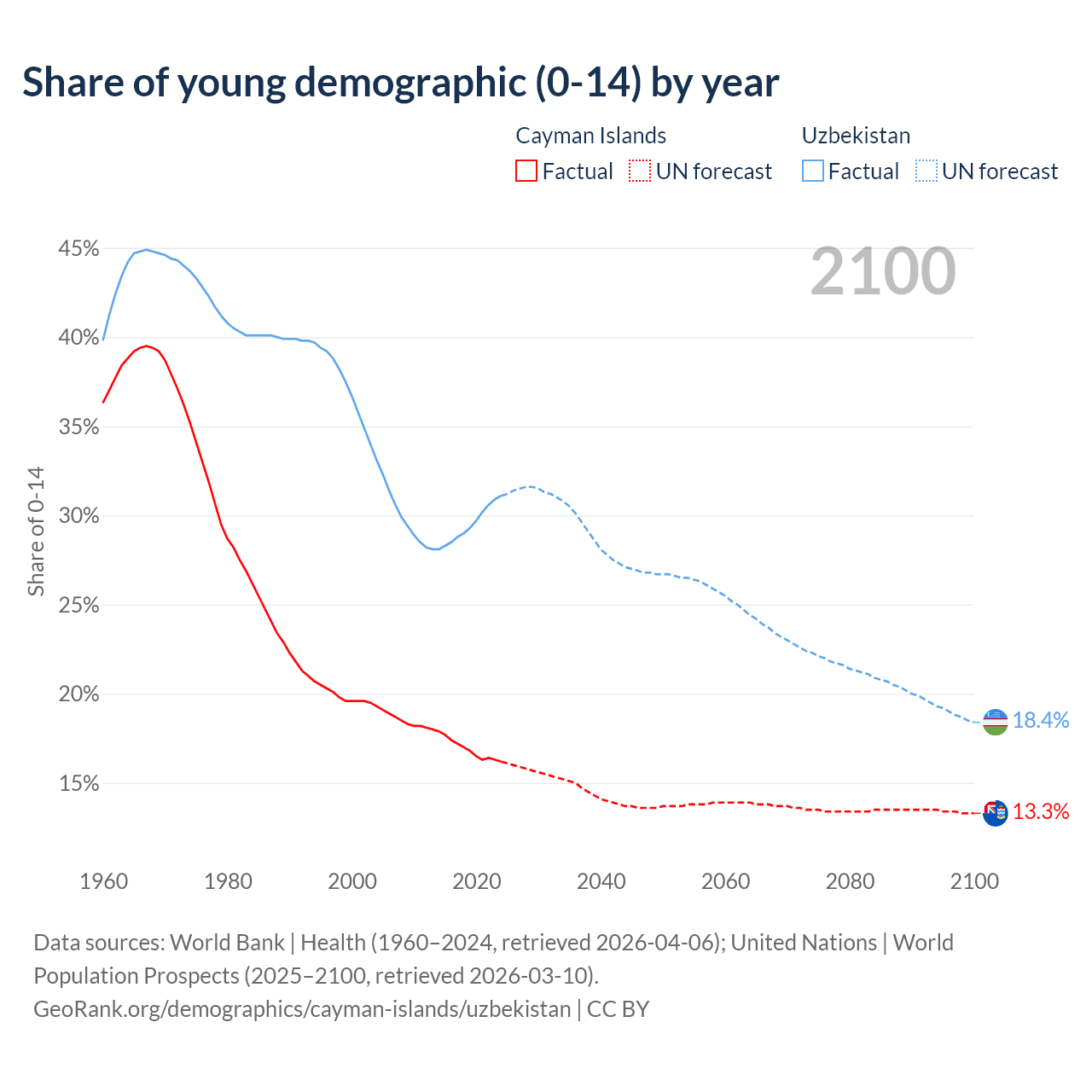 - The share of young demographic (0-15 years old) in the Cayman Islands is 16.2% vs 31.1% in Uzbekistan.
