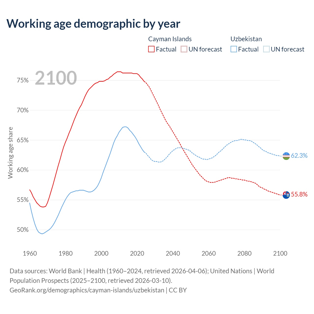 - The Cayman Islands has 58.1K working age adults (aged 15-64) vs 23.9M in Uzbekistan.