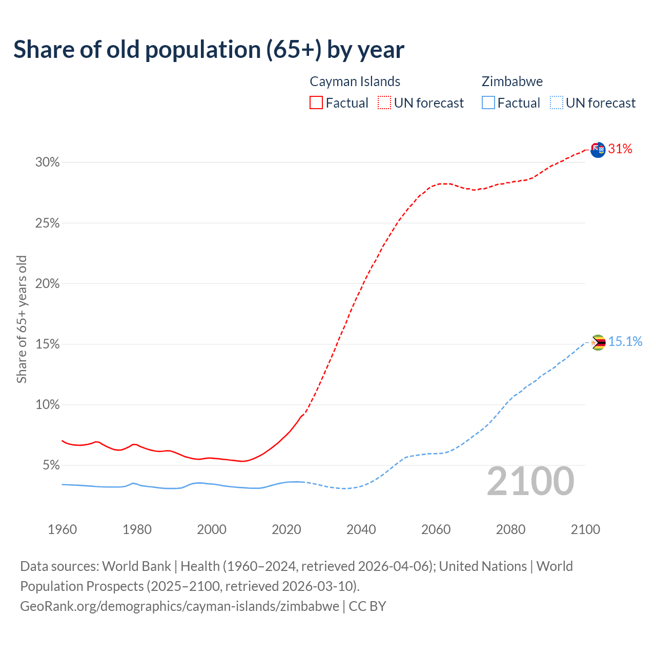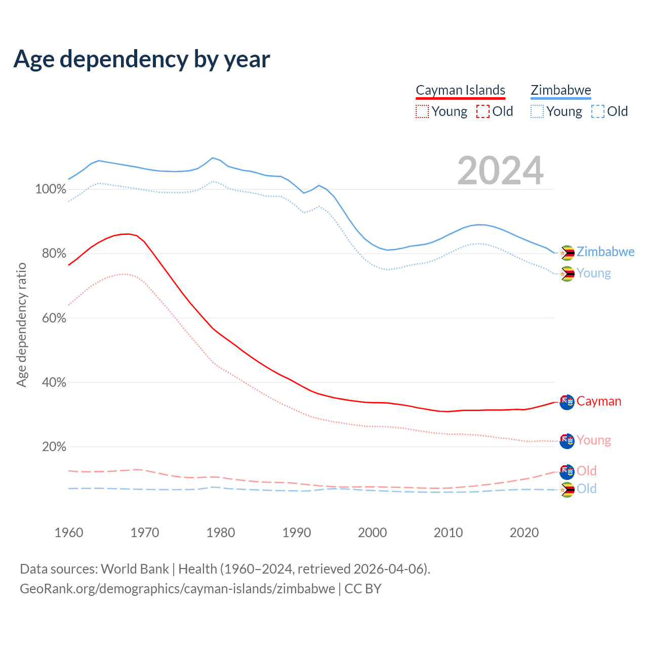 The share of older people aged 65 and over is 9% in the Cayman Islands and 3.6% in Zimbabwe. Life expectancy in the Cayman Islands compared to Zimbabwe .
