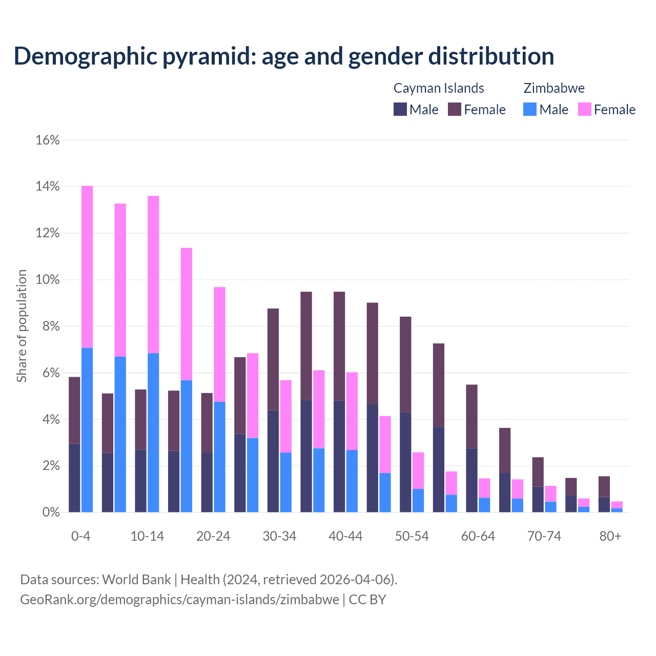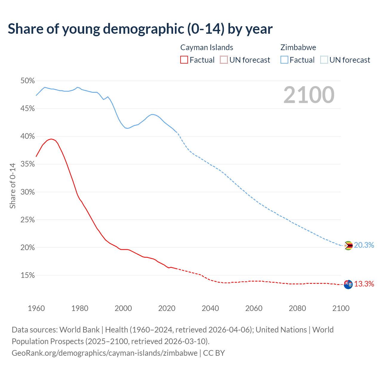 - The share of young demographic (0-15 years old) in the Cayman Islands is 16.2% vs 40.9% in Zimbabwe.