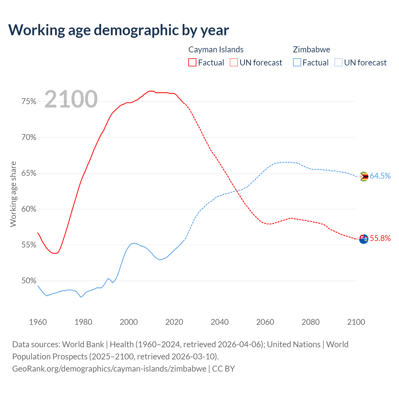 - The Cayman Islands has 58.1K working age adults (aged 15-64) vs 9.64M in Zimbabwe.