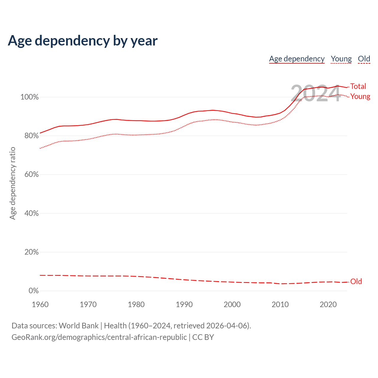 Data sources: World Bank | Health (1960–2024, retrieved 2026-04-06); U.S. Census Bureau (1960–2024, retrieved 2026-02-08).