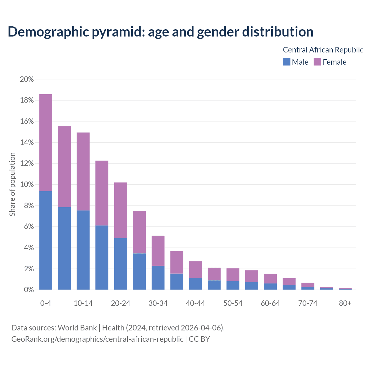 With a population of 5.33M people, the Central African Republic has a median age of 15.4 years which makes it the 196/196 oldest country. 49% of the demographic are children 0-14 years old, 48.8% are working-age people aged 15-64, and 2.15% are older population aged 65+ years.