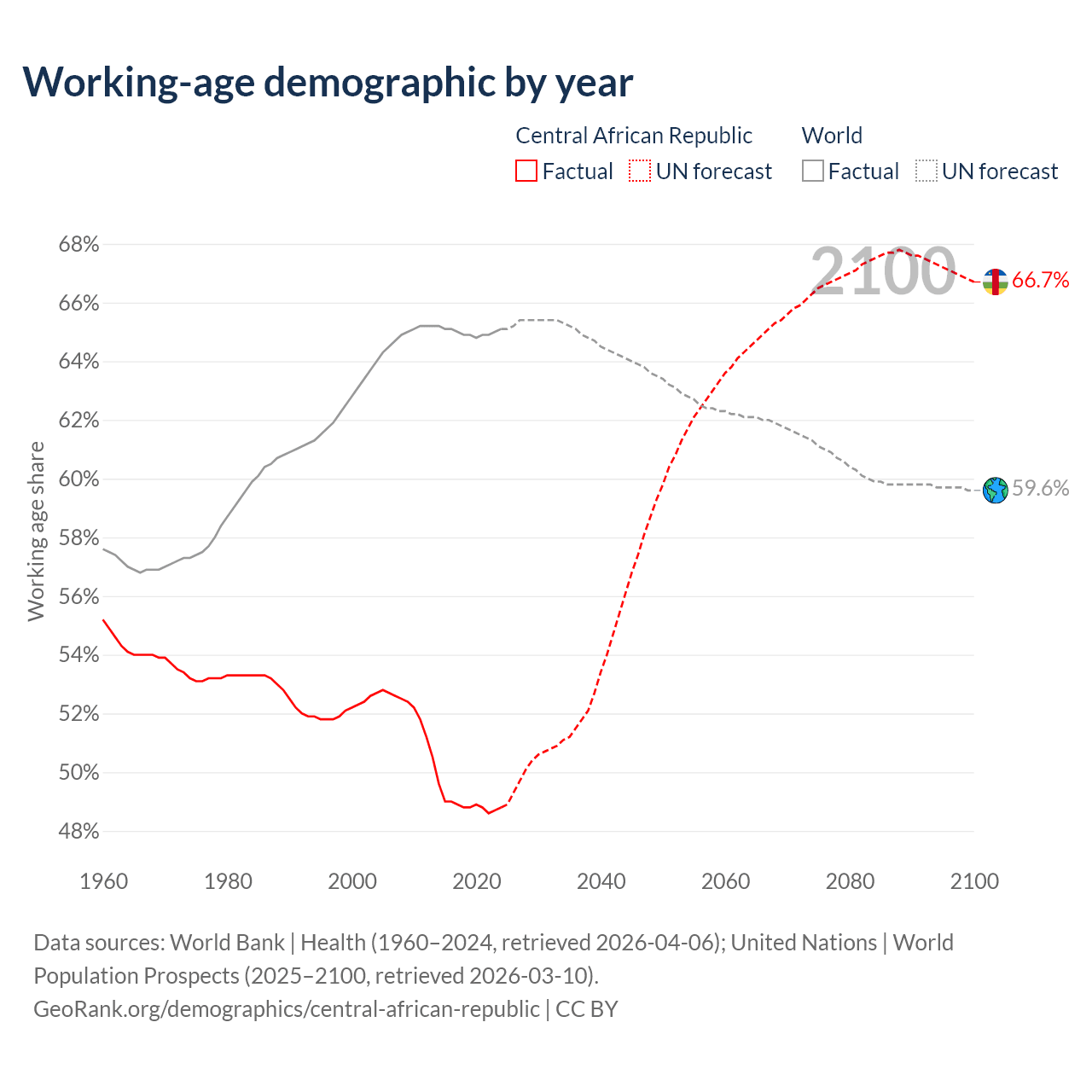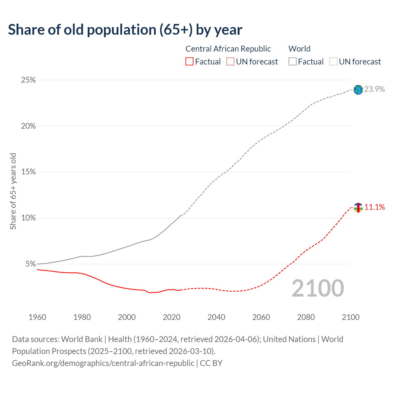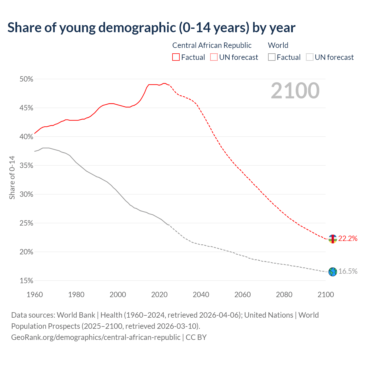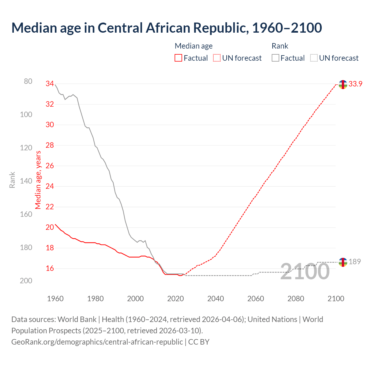 Median age in Central African Republic, 1960–2100