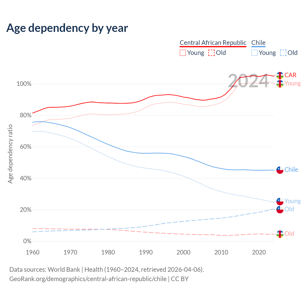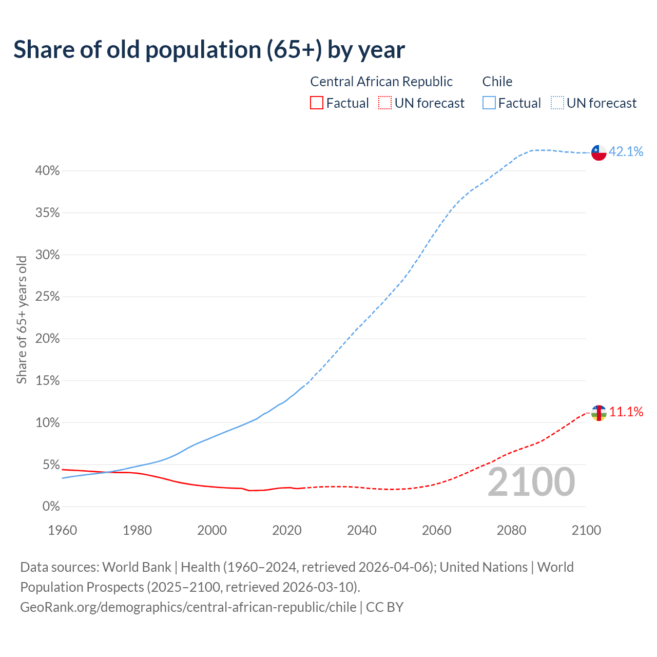 - The share of old-age demographic (65+) in the Central African Republic is 2.15% vs 14.1% in Chile.