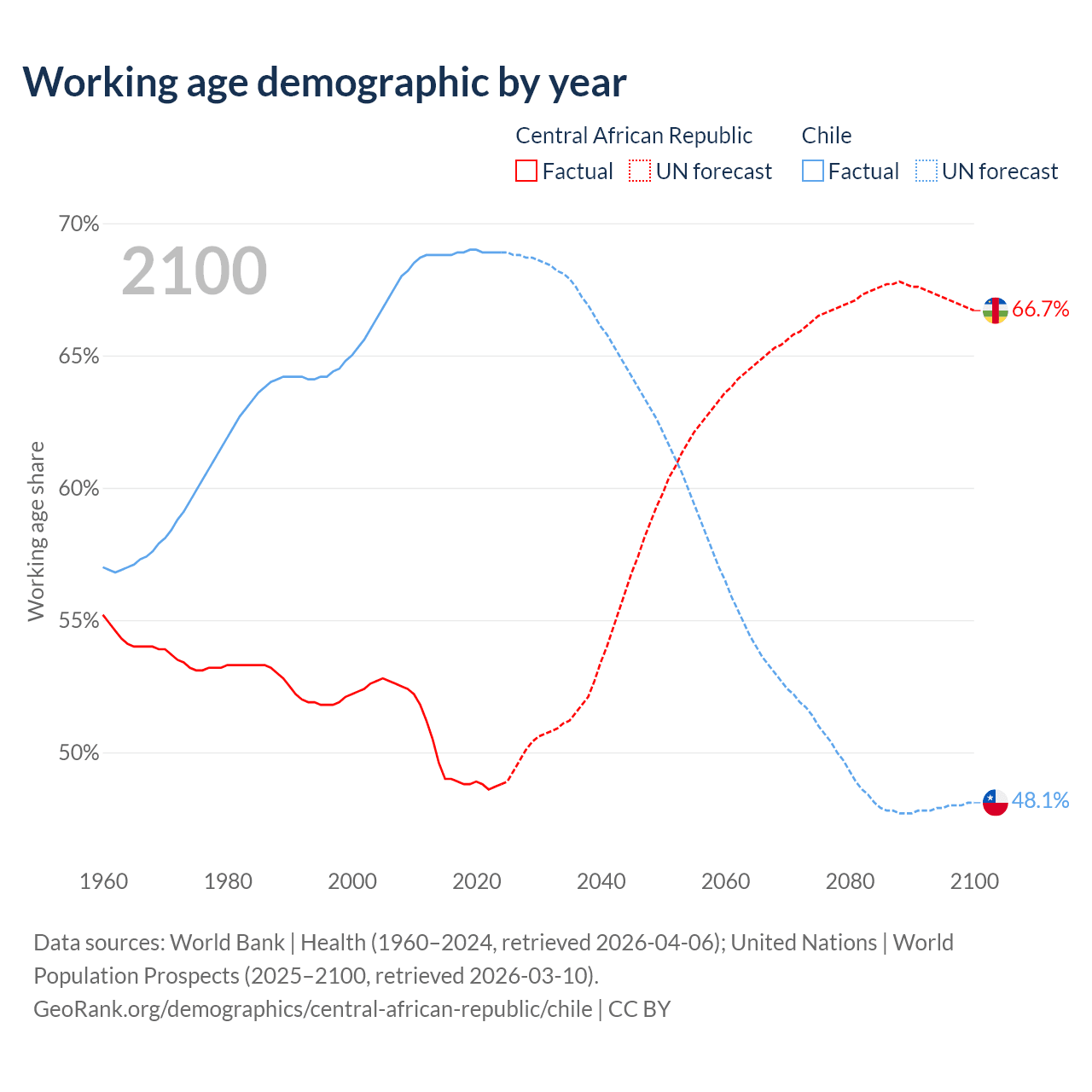 The share of older people aged 65 and over is 2.15% in the Central African Republic and 14.1% in Chile. Life expectancy in the Central African Republic compared to Chile .