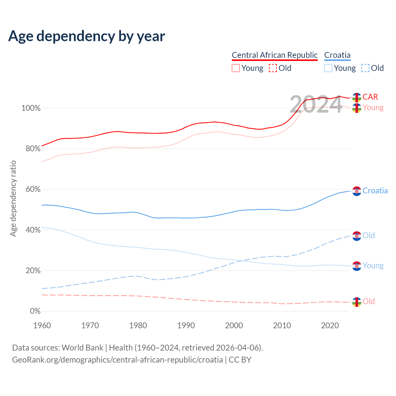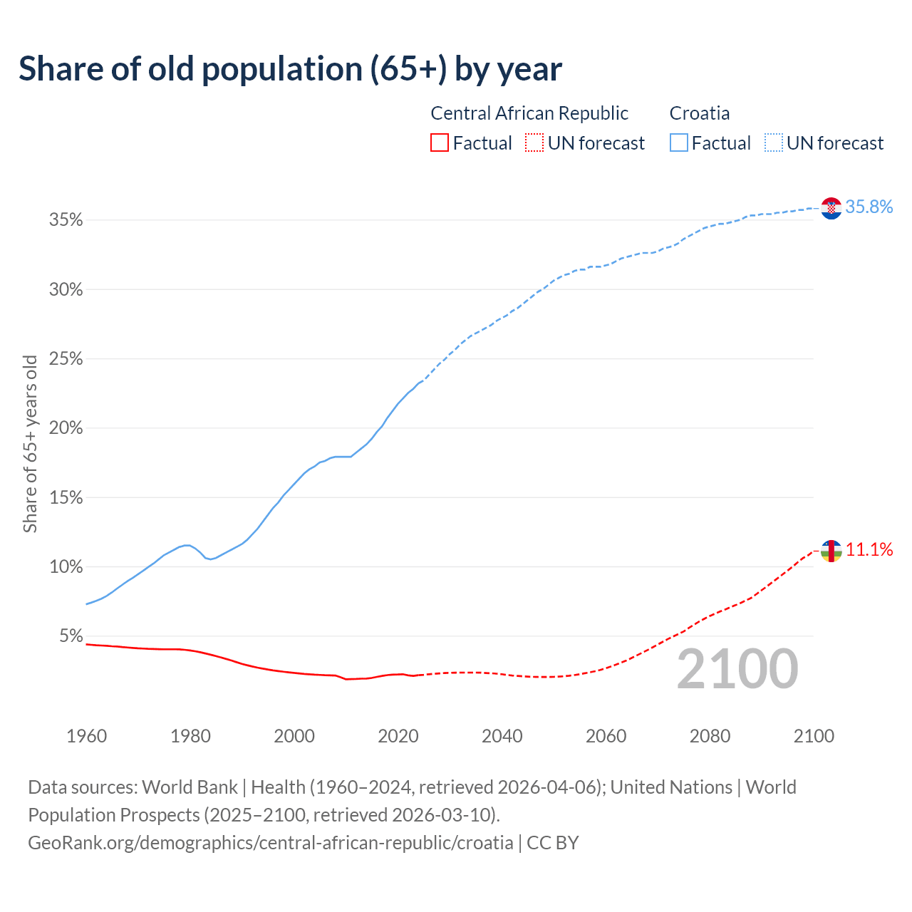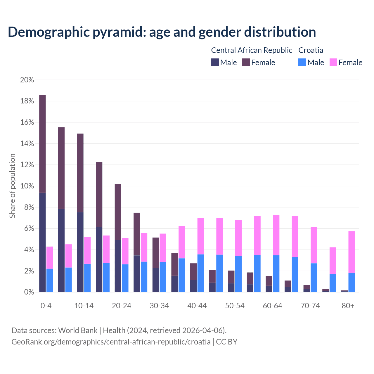 - The share of old-age demographic (65+) in the Central African Republic is 2.15% vs 23.2% in Croatia.