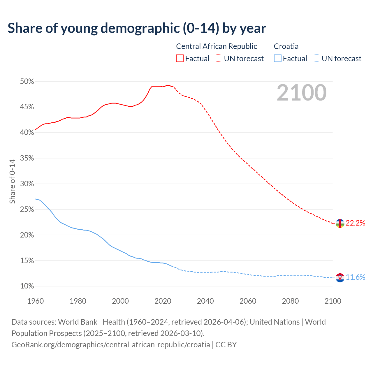 - The share of young demographic (0-15 years old) in the Central African Republic is 49% vs 13.9% in Croatia.