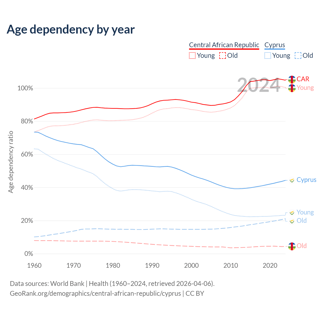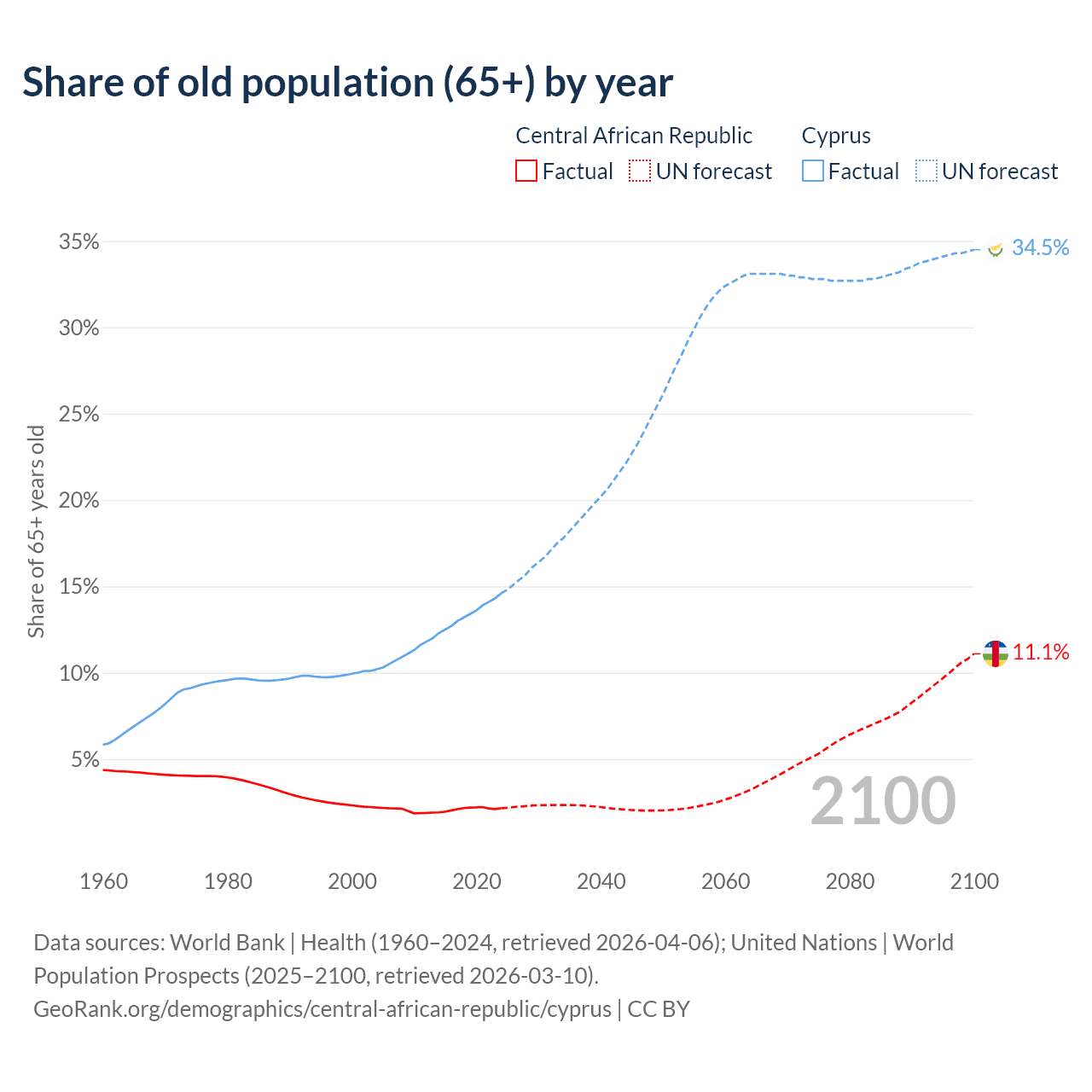 - The share of old-age demographic (65+) in the Central African Republic is 2.15% vs 14.6% in Cyprus.