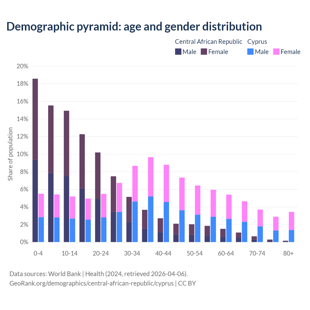 - The Central African Republic is ranked 196/196 by median age (oldest to youngest) vs 52/196 for Cyprus.