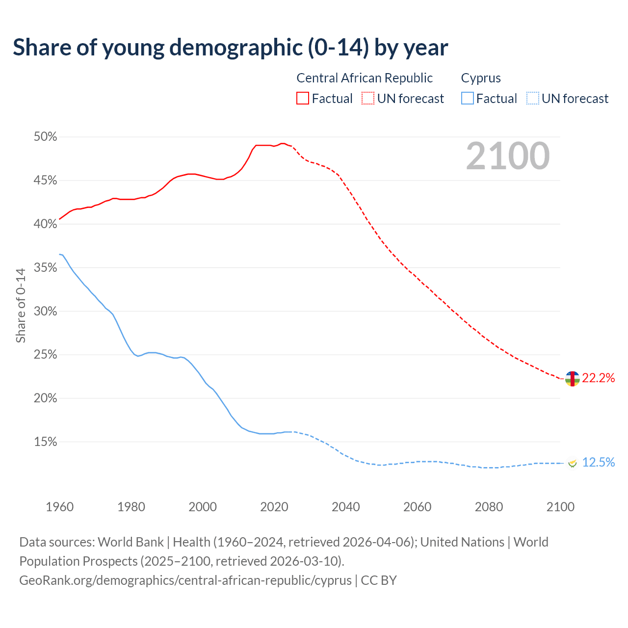 - The share of young demographic (0-15 years old) in the Central African Republic is 49% vs 16.1% in Cyprus.