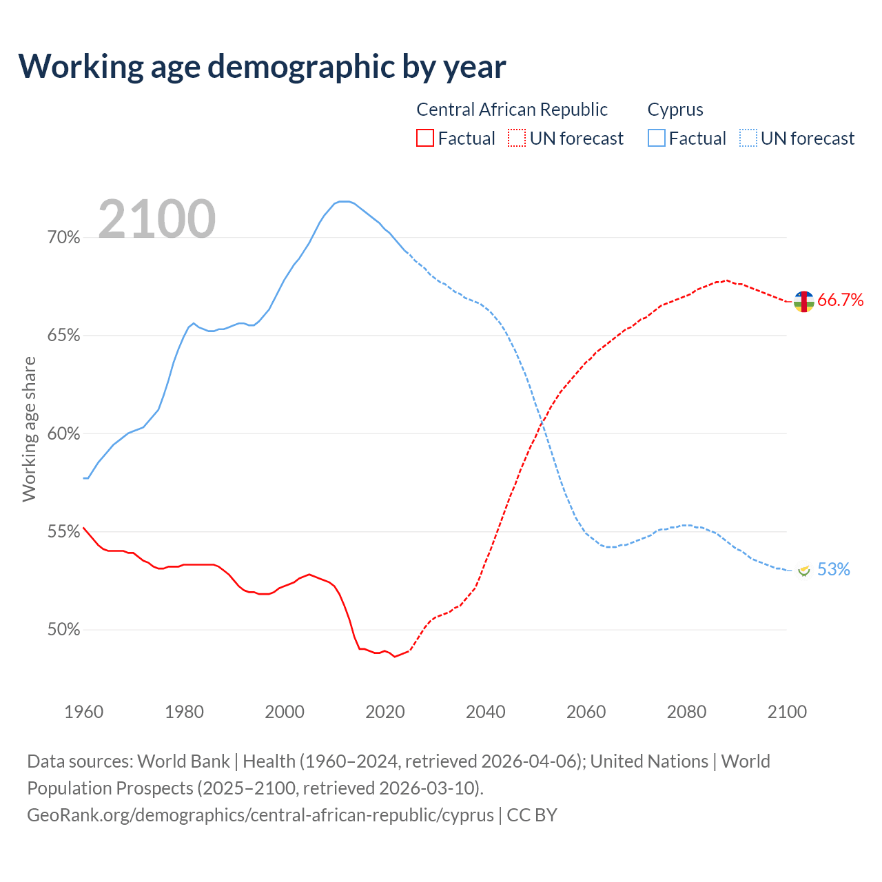 - The Central African Republic has 2.81M working age adults (aged 15-64) vs 961K in Cyprus.