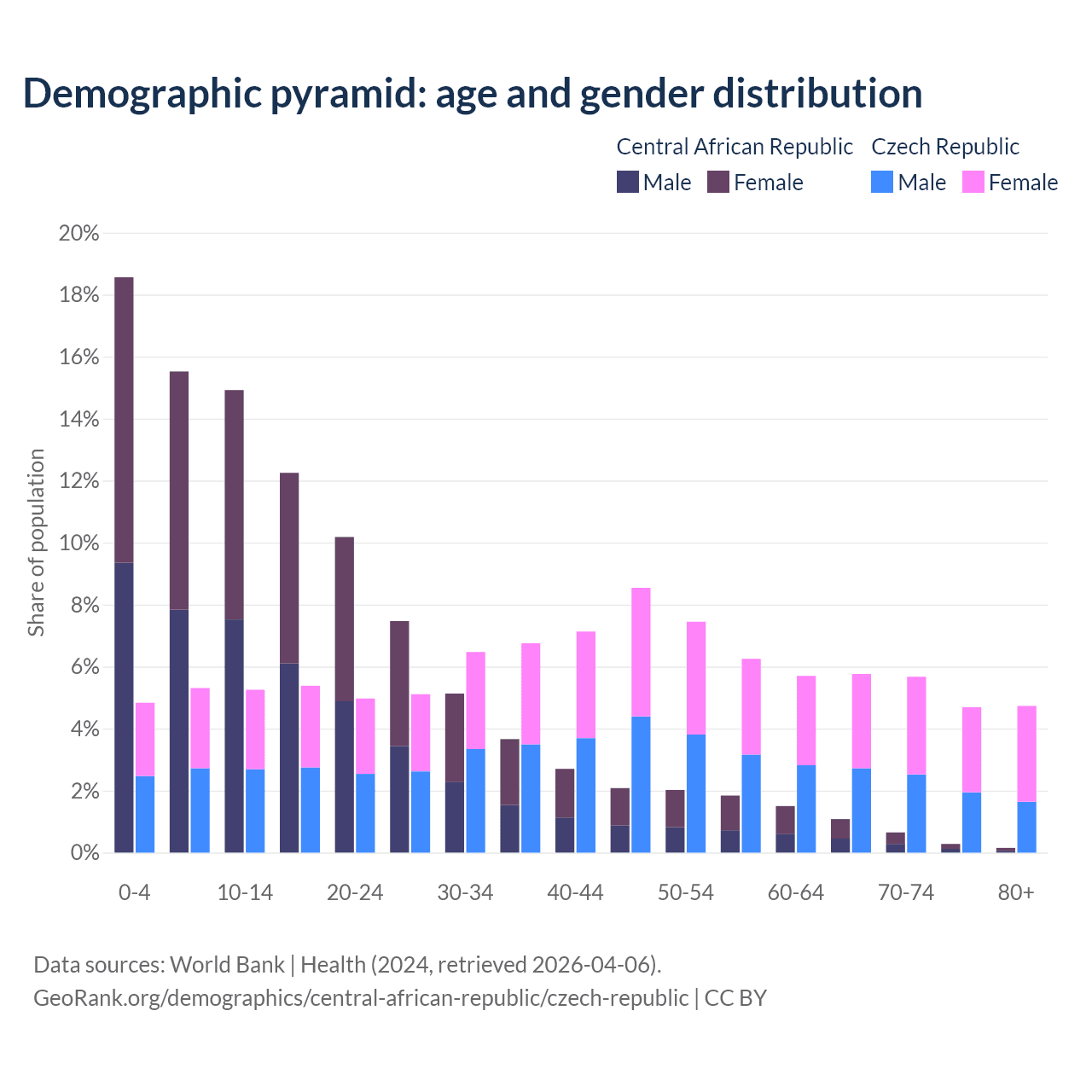 - The Central African Republic is ranked 196/196 by median age (oldest to youngest) vs 21/196 for the Czech Republic.