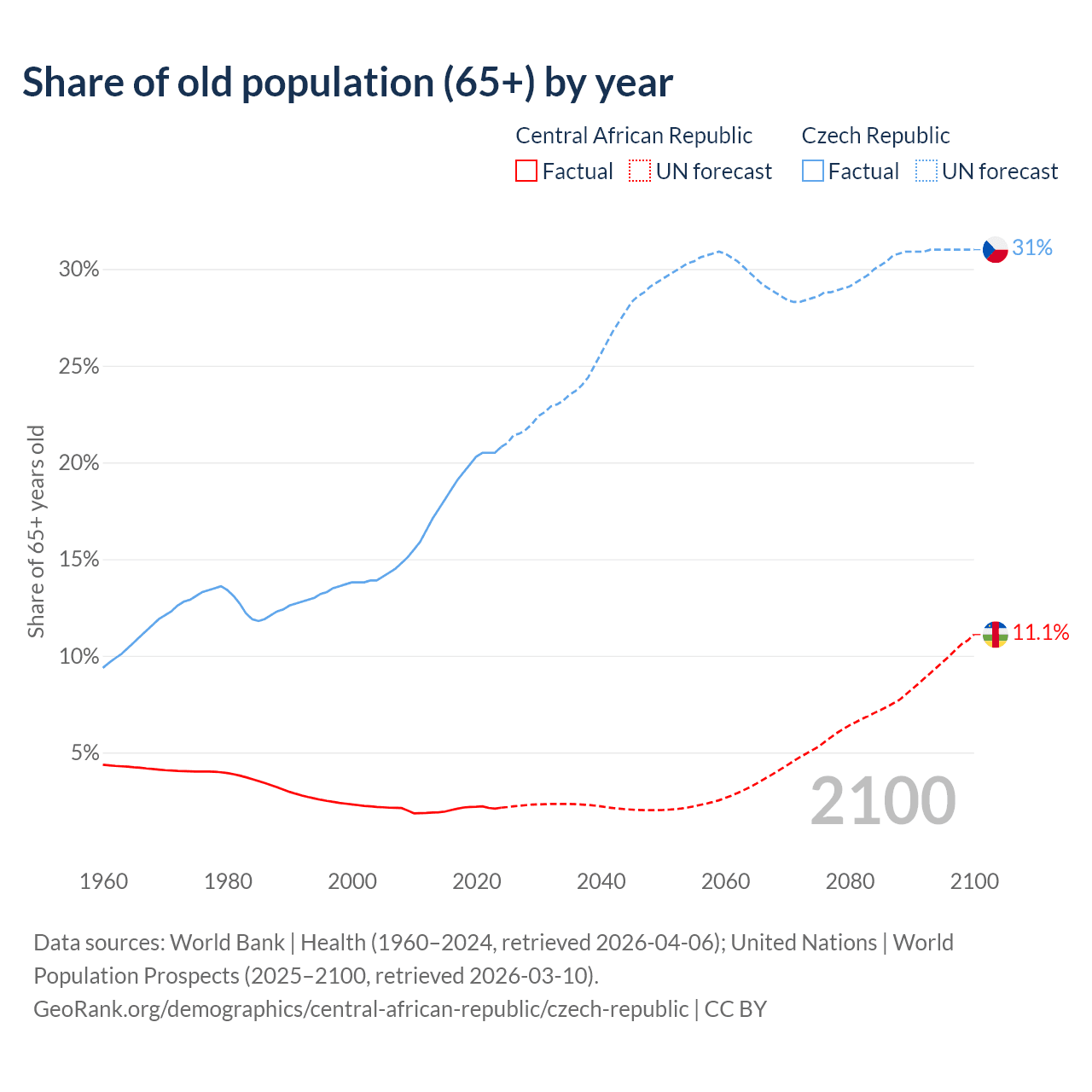 - The share of old-age demographic (65+) in the Central African Republic is 2.15% vs 20.8% in the Czech Republic.