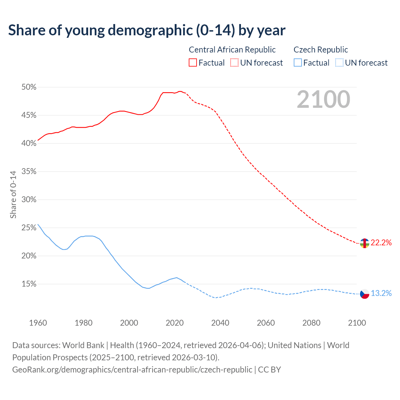 - The share of young demographic (0-15 years old) in the Central African Republic is 49% vs 15.4% in the Czech Republic.