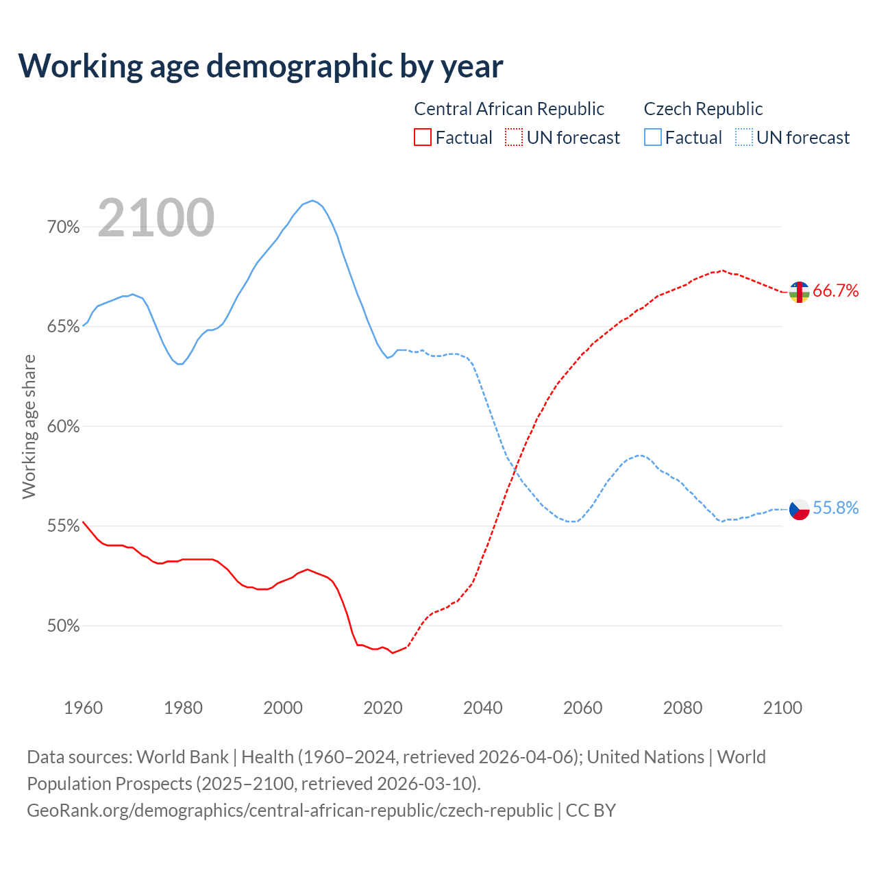 - The Central African Republic has 2.81M working age adults (aged 15-64) vs 6.79M in the Czech Republic.