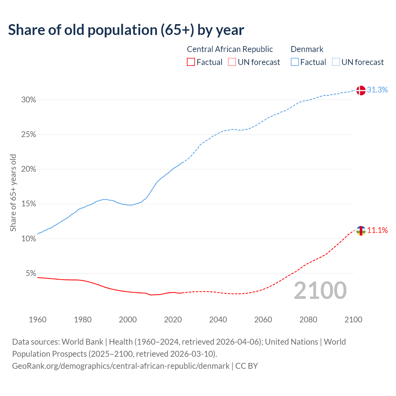 - The share of old-age demographic (65+) in the Central African Republic is 2.15% vs 20.9% in Denmark.