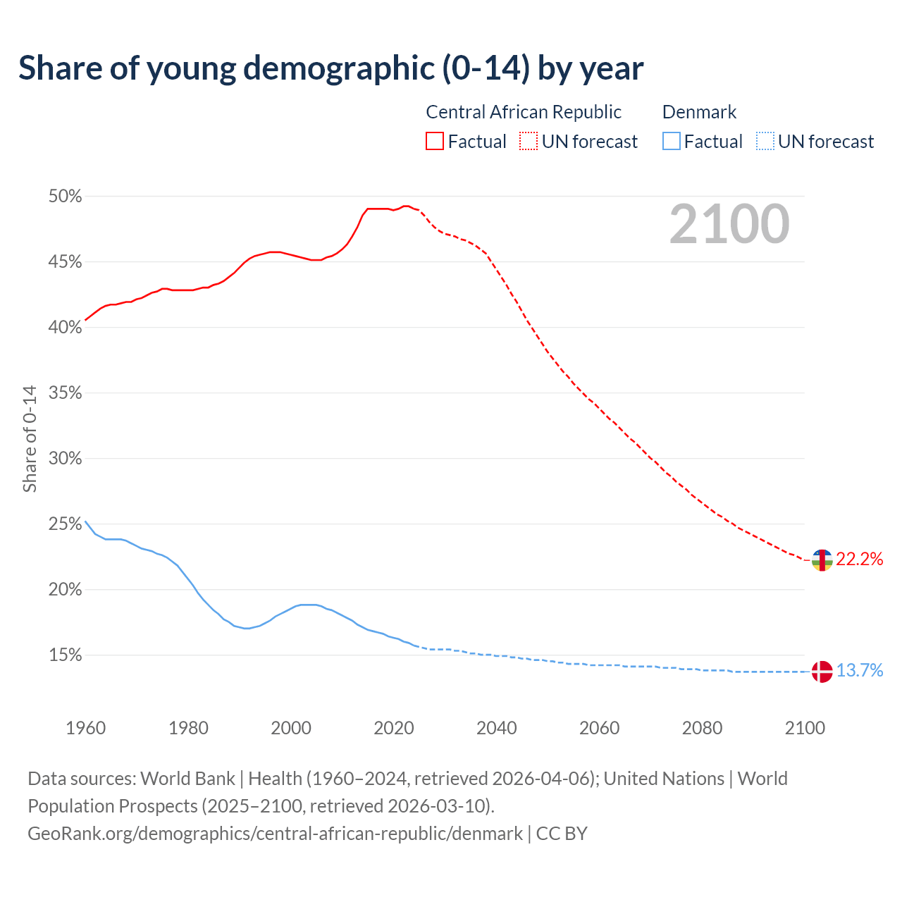- The share of young demographic (0-15 years old) in the Central African Republic is 49% vs 15.7% in Denmark.