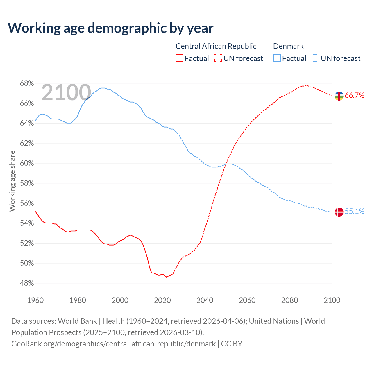 - The Central African Republic has 2.81M working age adults (aged 15-64) vs 3.83M in Denmark.